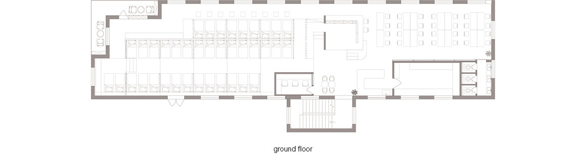 On the third floor, west-facing windows pull in daylight and the soft presence of street trees, moderating the interior with views of greenery. The teacher’s office and reception are placed near the entrance to keep oversight and circulation efficient. A central “wooden box” works as both partition and a small waiting-and-reading nook for guardians. Service areas such as the kitchen and restrooms are tucked into windowless zones, preserving the perimeter for spaces where light and activity matter most.