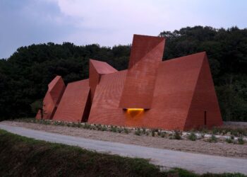 This is the Stay House located next to the slopes of Seoraksan Mountain. As one enters the village, the front facade is designed to be both a wall and a boundary, seamlessly connecting the boundary between architecture and the land. The subtly tilted exterior resembles the characteristic rocky terrain of Seoraksan Mountain, creating a shape that changes slightly depending on the viewing angle, almost as if it moves very slowly. Not only in form but also in color and material, it evokes the rocky terrain within Seoraksan Mountain. Amidst the rough monochrome mass, the orange entrance stands out as a vivid accent, becoming a pathway to experience the diversity of boundaries every time the door is opened or closed. The colors reminiscent of the sunset and autumn leaves shine through the cracks of the aged and sturdy rocks, resembling a mysterious mineral.