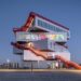 The remodeling process maximized the existing structure while integrating new functional spaces as distinct elements. This deliberate approach preserved the original identity while clearly defining its modern use. Three key architectural additions were introduced: a vertical circulation core (elevator and stairwell), a horizontal exhibition space, and an observation deck at the top. Positioned at the building’s rear corner, the elevator and stairwell emphasize verticality, with staircases of varying lengths layered like banners, creating dynamic movement. The exhibition space, inserted within the 22-column exterior, stretches through the existing structure with minimal intervention, serving as both an exhibition hall and an observatory. Visitors follow the path of the former overhead crane, exploring the site’s remnants. Clad in corrugated steel, the gabled observation deck offers views of the preserved dust collection facility and the entire industrial complex.