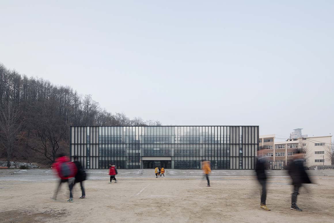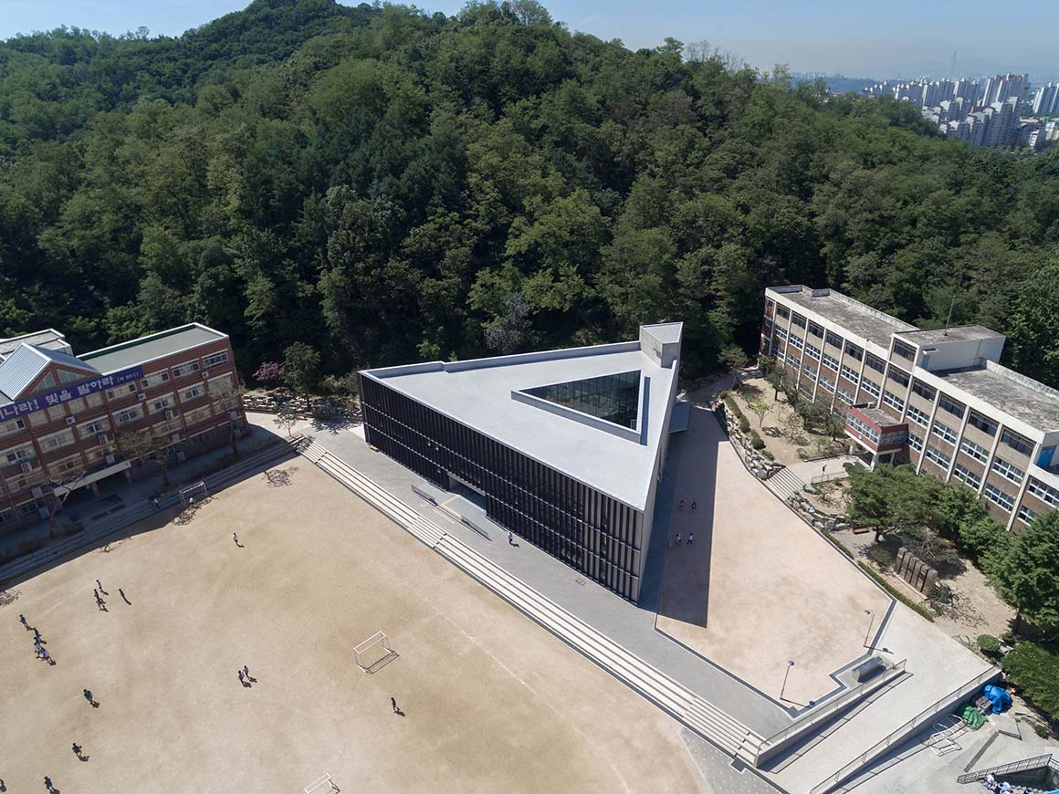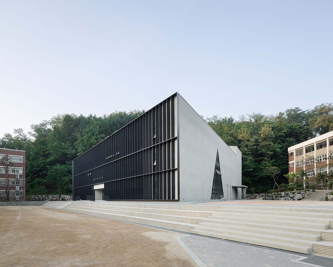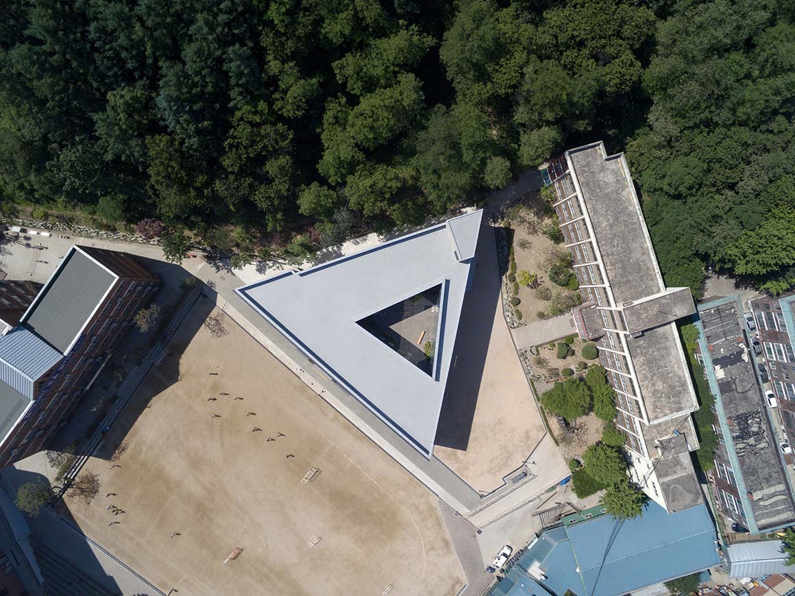 This new structure stands on the campus of Donghwa High School in Namyangju, Gyeonggi Province. As its nickname, “Triangle School,” suggests, the architecture begins with the three edges of the site: the empty playground to the north, the wooded hillside to the east, and the middle school building to the west. These three distinct contexts naturally draw out a triangular configuration. The building opens wide toward the playground, closes itself toward the middle school, and responds to the forested hillside with a mediated approach in both façade and plan.