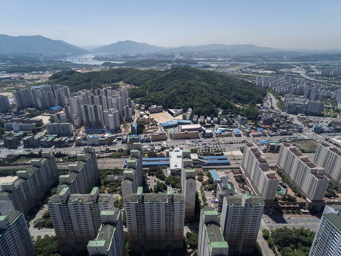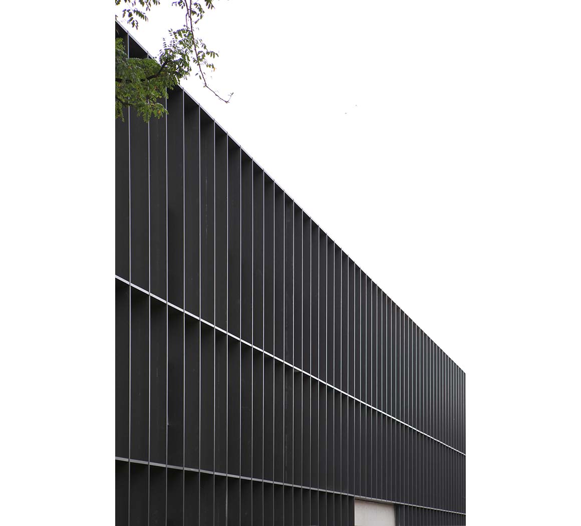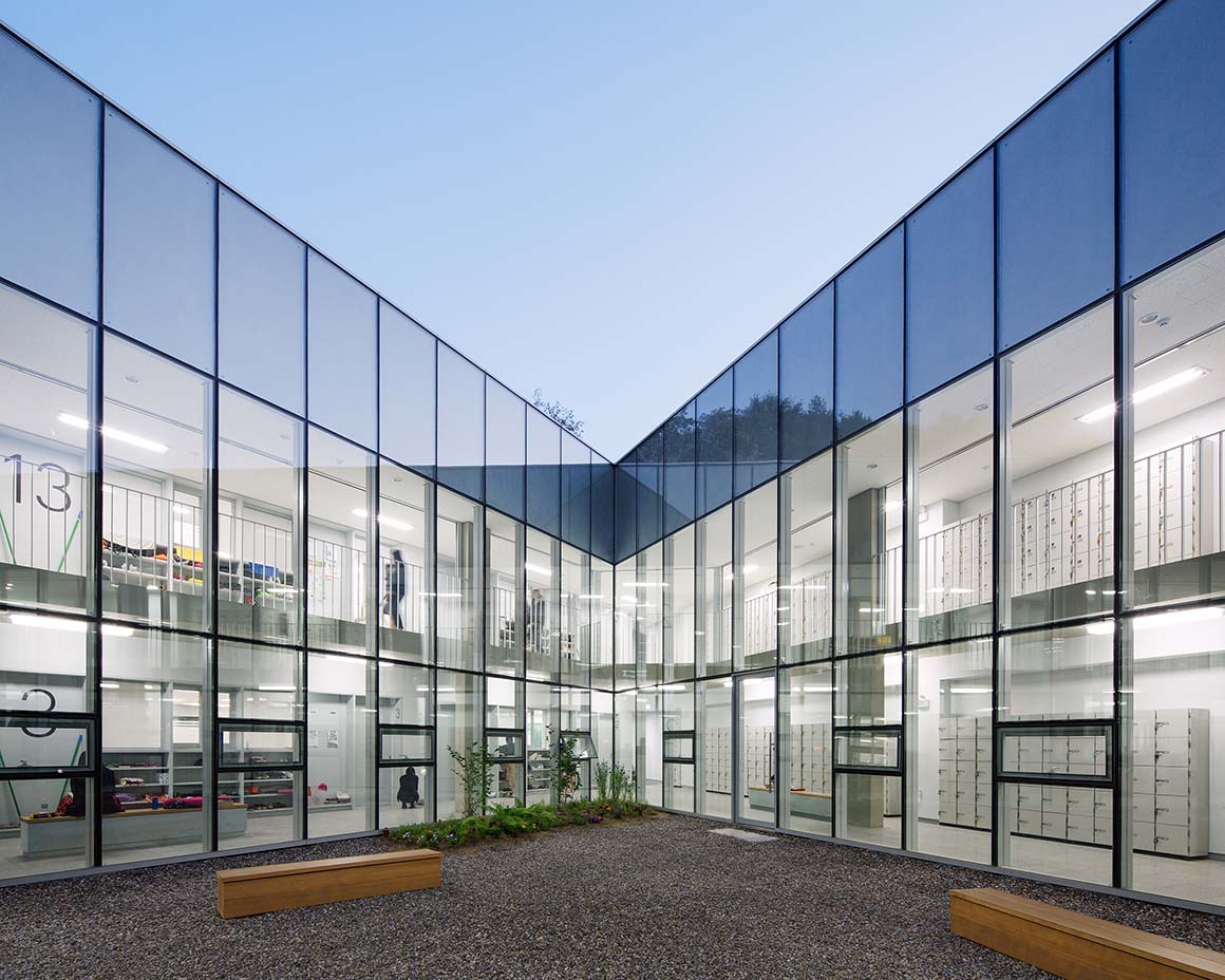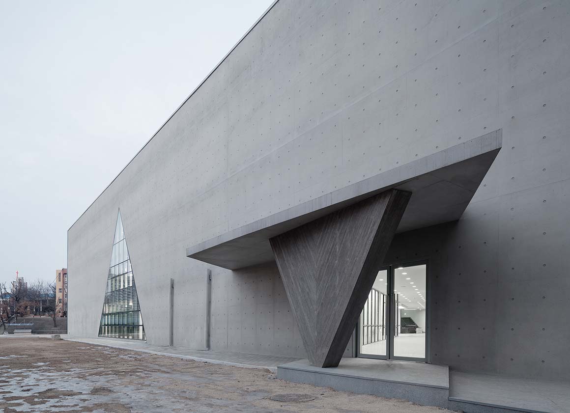 This new structure stands on the campus of Donghwa High School in Namyangju, Gyeonggi Province. As its nickname, “Triangle School,” suggests, the architecture begins with the three edges of the site: the empty playground to the north, the wooded hillside to the east, and the middle school building to the west. These three distinct contexts naturally draw out a triangular configuration. The building opens wide toward the playground, closes itself toward the middle school, and responds to the forested hillside with a mediated approach in both façade and plan.