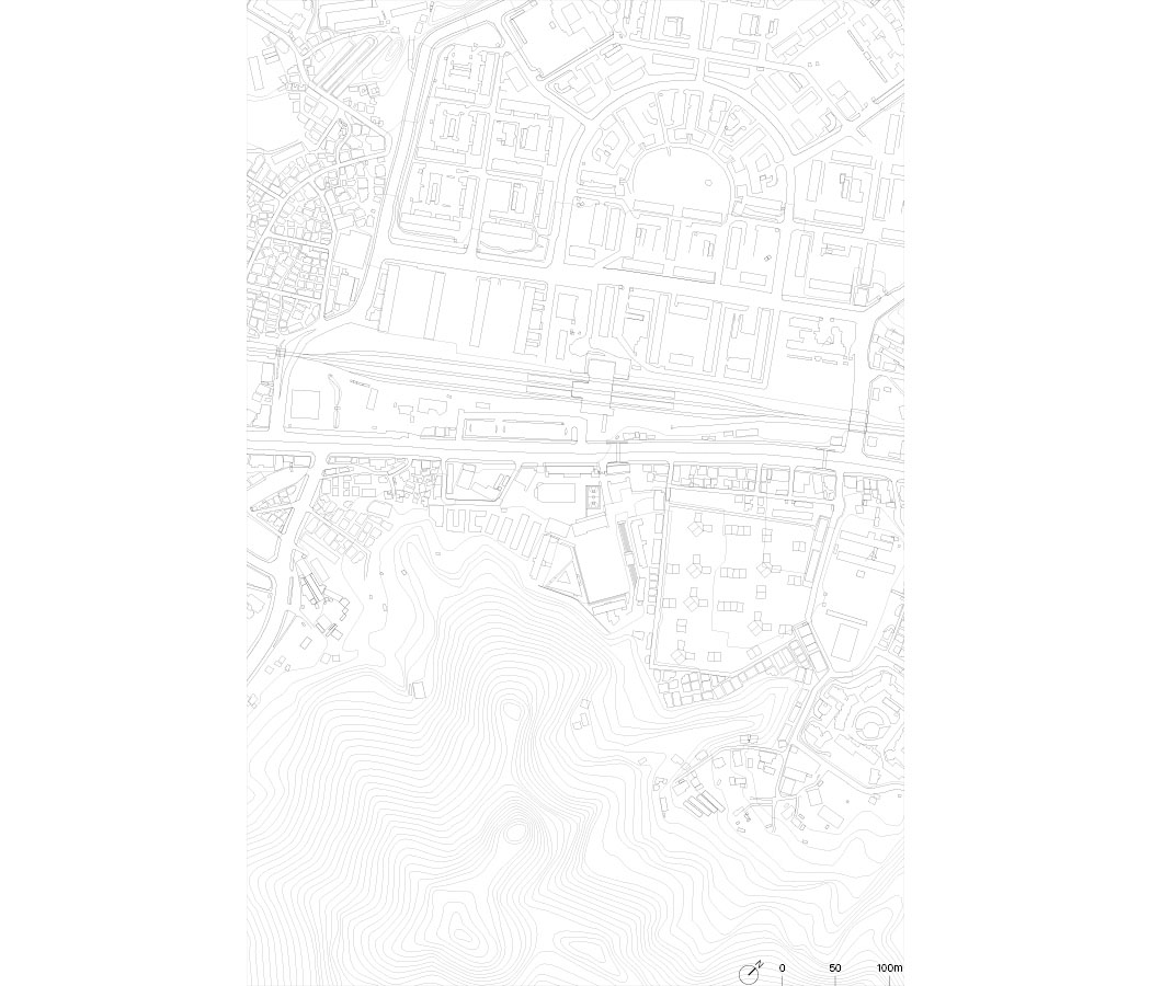 The site was once a piece of ground where greenery slowly spilled into the empty playground between buildings. Exactly at this spot, a new order has been introduced—one that distinctly alters the existing flow. It comes as a large point of emphasis, yet feels unfamiliar, like an angular accent mark. The once loose and relaxed terrain now carries a sense of tension imposed by a sharp-edged triangle. That unfamiliar tension is breathing new energy into the otherwise static scenery of the surrounding old buildings, the empty playground, and the adjacent forest edge.