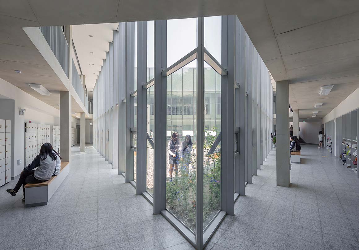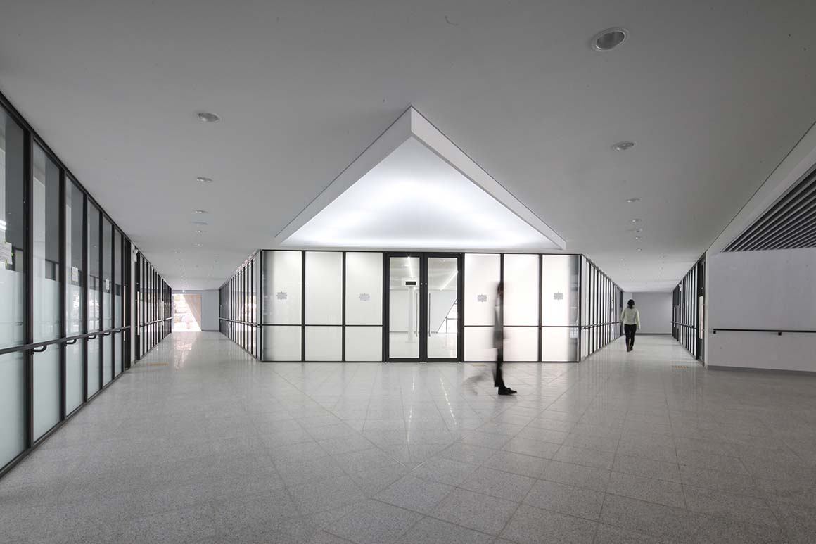 The corridors facing the courtyard vary in width from 2.4 to 5.5 meters. Although they form a typical triangular circulation loop around the courtyard, they do far more than function as passageways. As a space where students spend their daily lives, it extends its function into a place for discussion, chatter, learning, and play. Rather than being controlled and restrained in the name of school order, it is envisioned as a lively, bustling environment—almost like a noisy marketplace—filled with the students‘ autonomy and social energy.