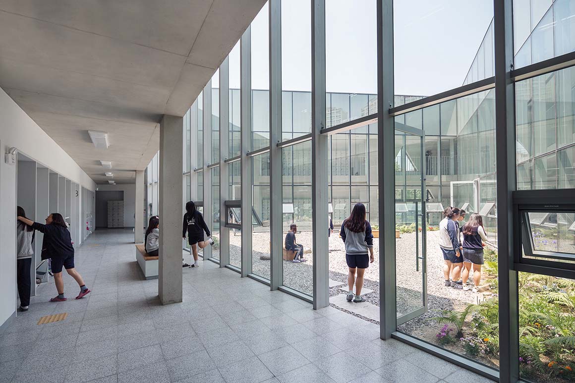 Not only does the building allow communication between floors, but it also opens views across the courtyard to the left and right, enabling visual and spatial connection from virtually any point inside. This is what allows the fluid movement of its users to unfold naturally within an otherwise rigid physical structure. Above all, the transparency of the courtyard dissolves the boundary between inside and outside, unfolding an open learning environment like a panoramic scene. These bright, expansive scenes seem to express a commitment to fostering a school life that feels psychologically as well as physically uplifting.