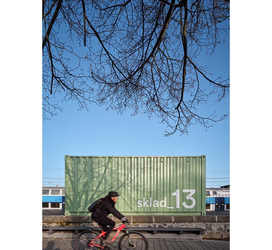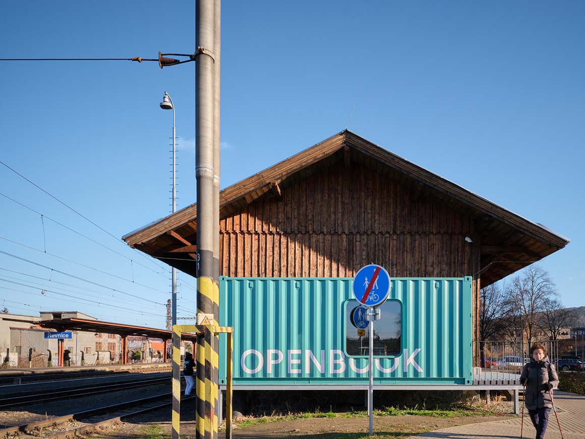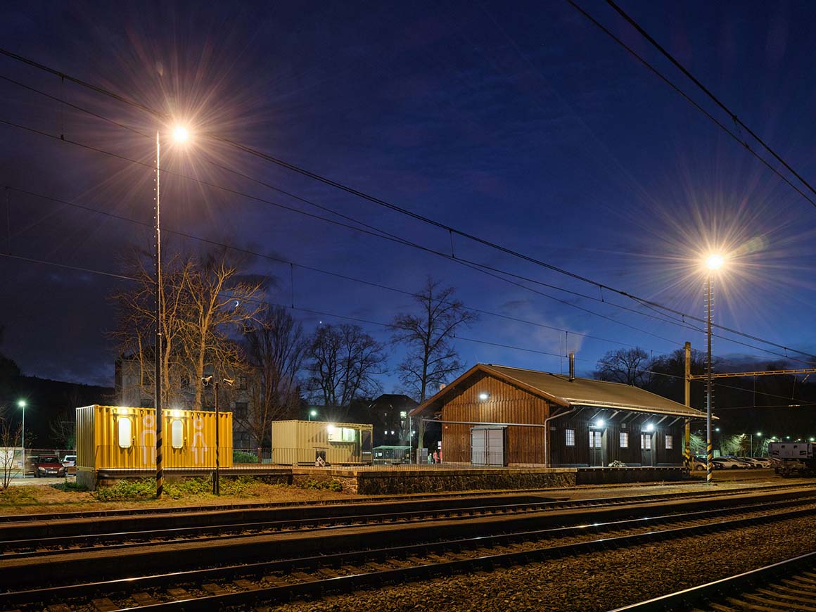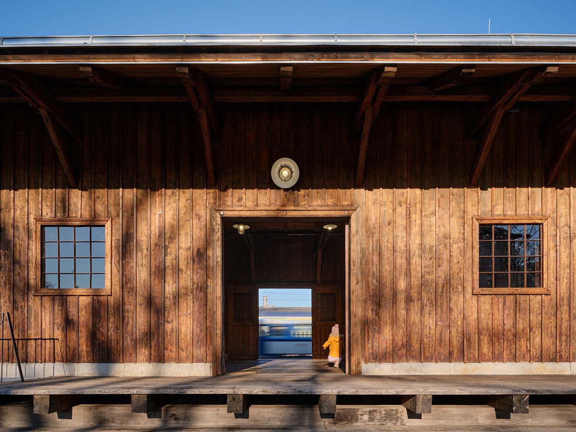 The building, topped with a solid pitched roof, covers 246m². To function as a cultural venue, essential facilities were required. The solution needed to preserve the openness of the interior while adding restrooms, storage, a small kitchen, and minimal office space. The answer came in the form of containers. These modern logistics units were converted into architectural elements, creating a new entrance and separating the bar from the gallery. Their corrugated exteriors contrast with the timber warehouse while harmonizing with the materiality of passing freight trains, showing the relationship between old and new elements. Insulation was added, and rounded windows evoking train carriages were incorporated. Each container is distinctly colored. Two sloped ramps along the building’s front and side are lined with benches and steps, ensuring the surrounding space remains lively even on days without events. The location is convenient, adjacent to the train station, near the local bus transfer hub, and just a few minutes’ walk from the city center.