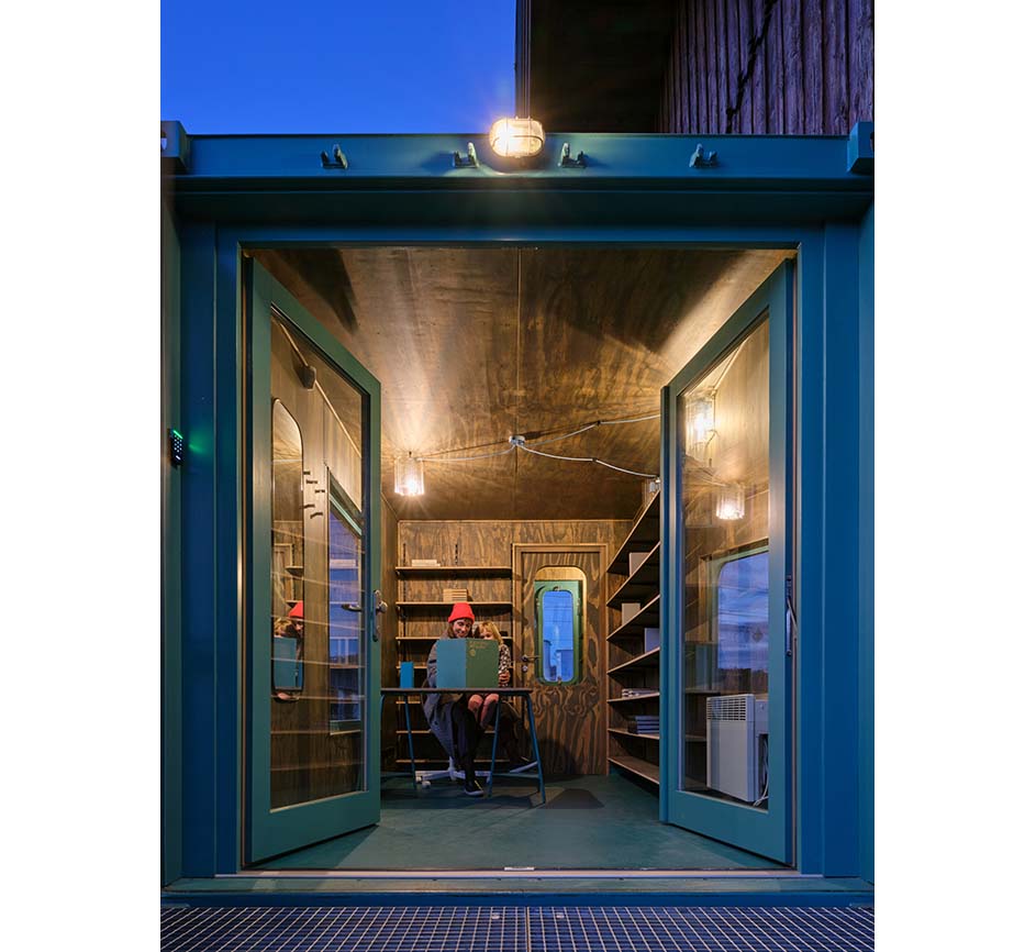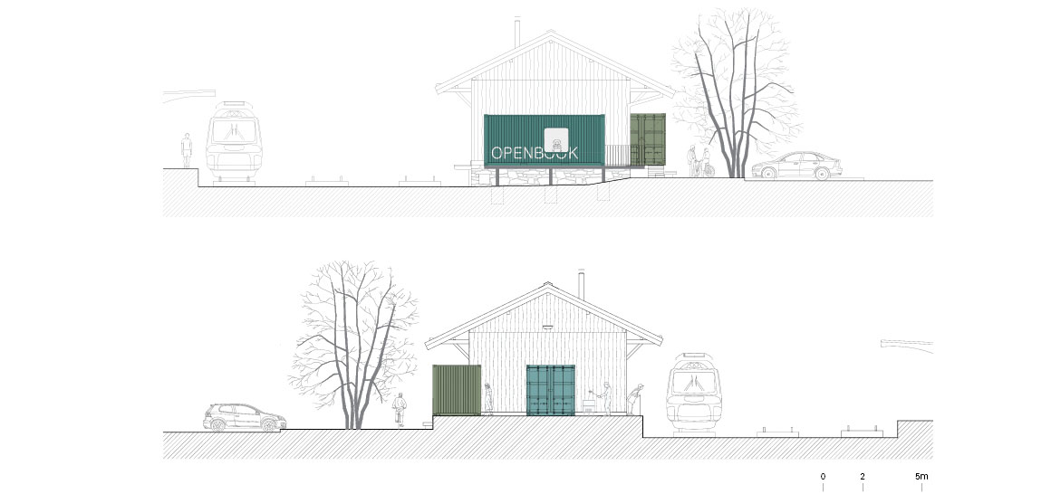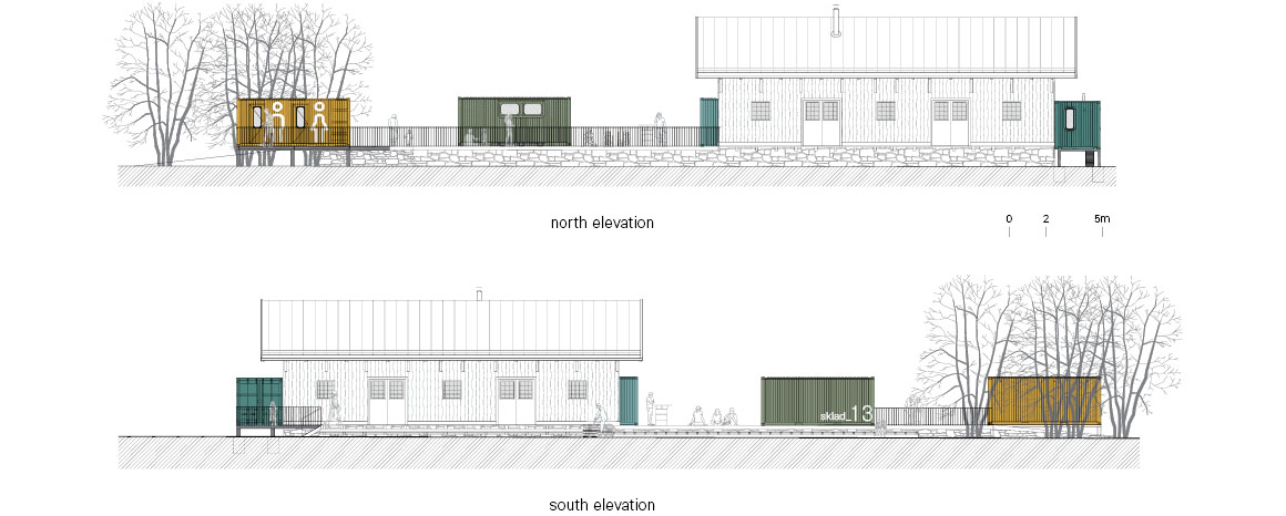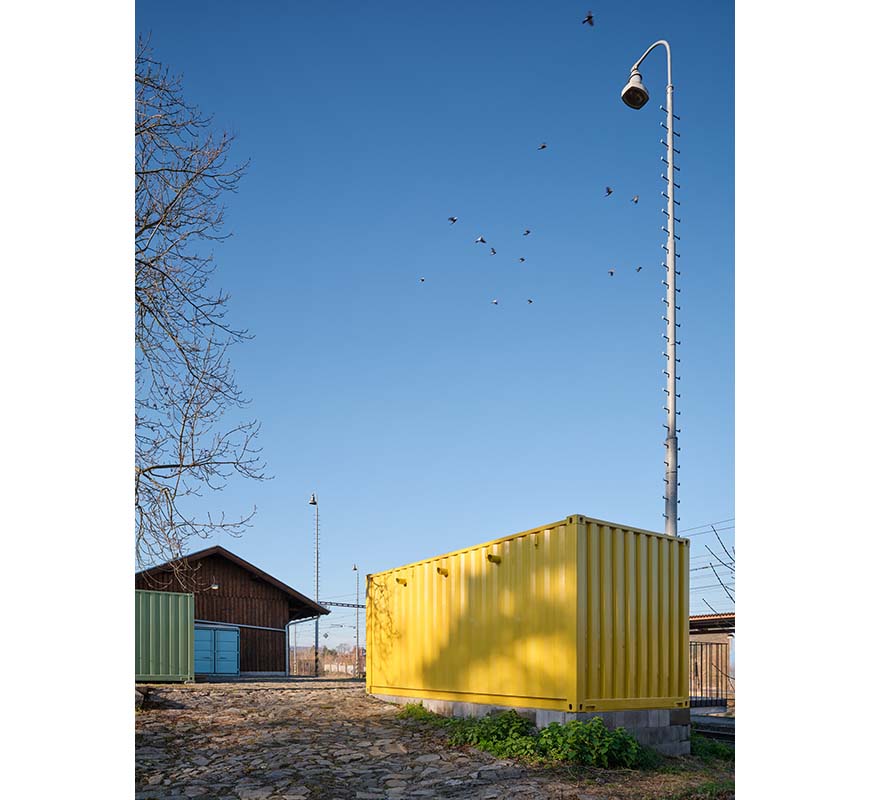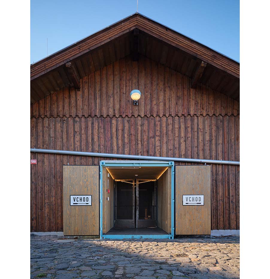 The building, topped with a solid pitched roof, covers 246m². To function as a cultural venue, essential facilities were required. The solution needed to preserve the openness of the interior while adding restrooms, storage, a small kitchen, and minimal office space. The answer came in the form of containers. These modern logistics units were converted into architectural elements, creating a new entrance and separating the bar from the gallery. Their corrugated exteriors contrast with the timber warehouse while harmonizing with the materiality of passing freight trains, showing the relationship between old and new elements. Insulation was added, and rounded windows evoking train carriages were incorporated. Each container is distinctly colored. Two sloped ramps along the building’s front and side are lined with benches and steps, ensuring the surrounding space remains lively even on days without events. The location is convenient, adjacent to the train station, near the local bus transfer hub, and just a few minutes’ walk from the city center.