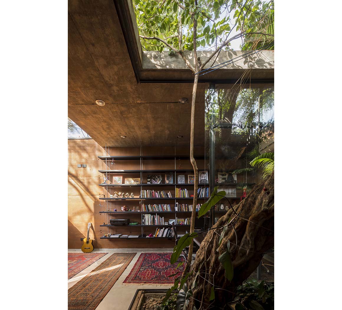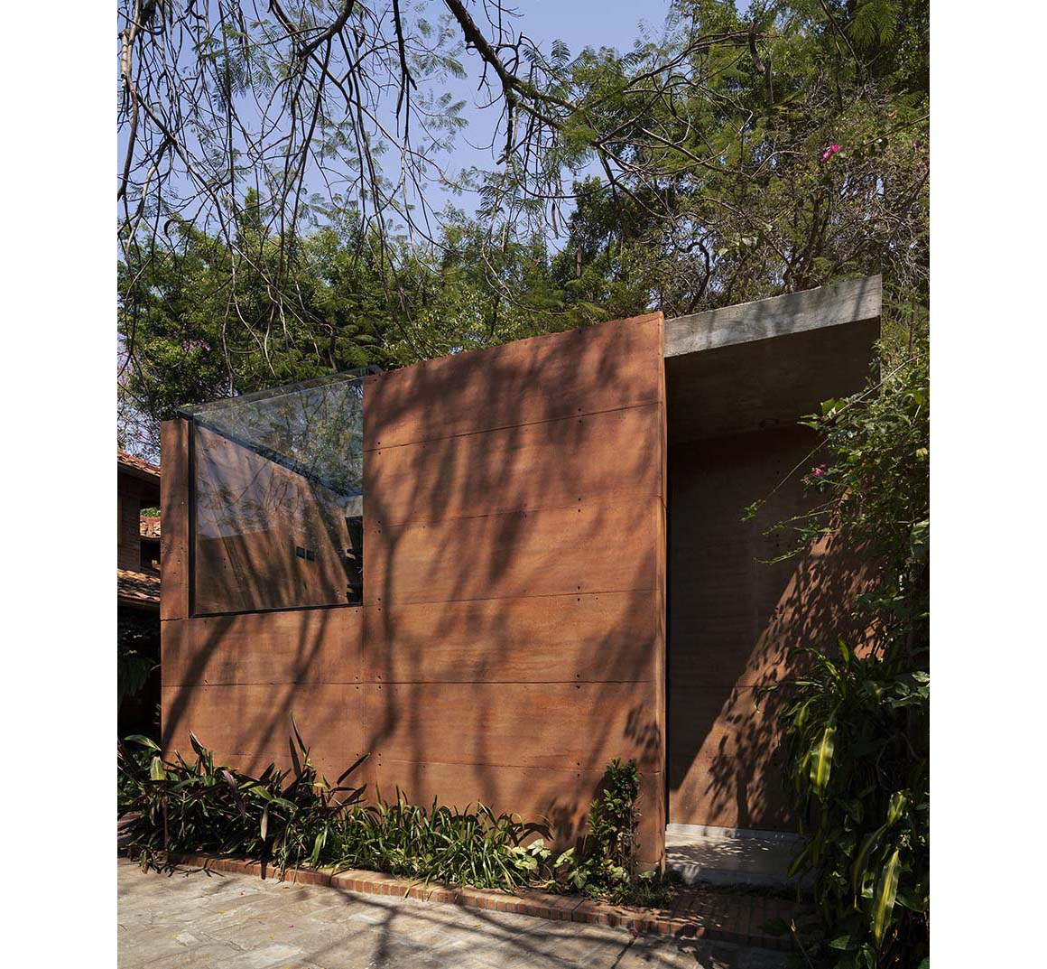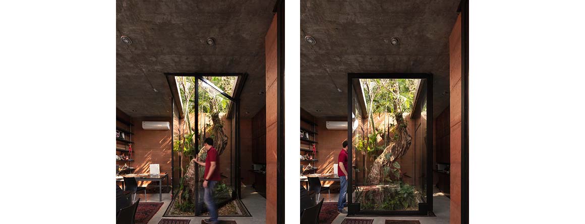 The external rammed earth wall wraps the basic square plan entirely; it retracts at the point of the office’s main entrance. In so doing it bends around a little restroom. The towering, pre-existing guavirà tree is situated within a patio dividing the work-spaces from the kitchen, all the while blurring the boundaries between interior and exterior.