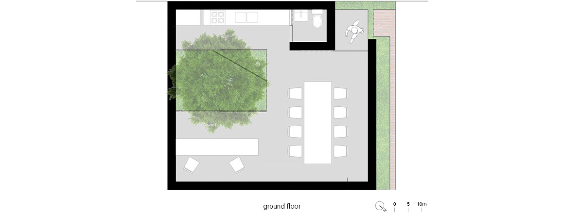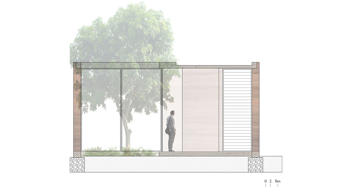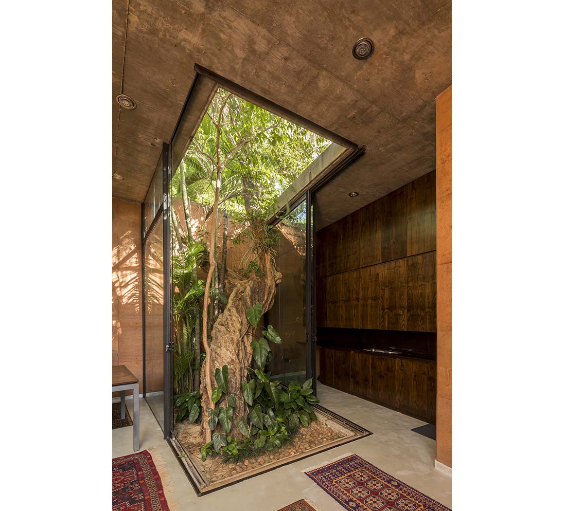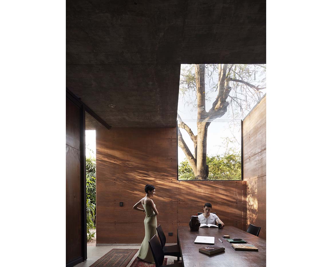 The external rammed earth wall wraps the basic square plan entirely; it retracts at the point of the office’s main entrance. In so doing it bends around a little restroom. The towering, pre-existing guavirà tree is situated within a patio dividing the work-spaces from the kitchen, all the while blurring the boundaries between interior and exterior.