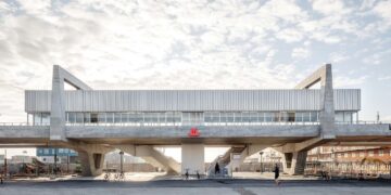 The connecting element is the ‘street’. Corridors weave through all the workspaces, encouraging people to interact and collaborate freely. At the end of the first floor, the largest area is a double-height space. It starts with a large open area and transitions into smaller workspaces around a central core of stairwells, restrooms, and kitchen facilities. The ground floor opens directly to the public outdoor space, acting as a breathing lung for the activity inside. It draws in plenty of sunlight through high ceilings, openings, and glass in the dome-shaped roof.