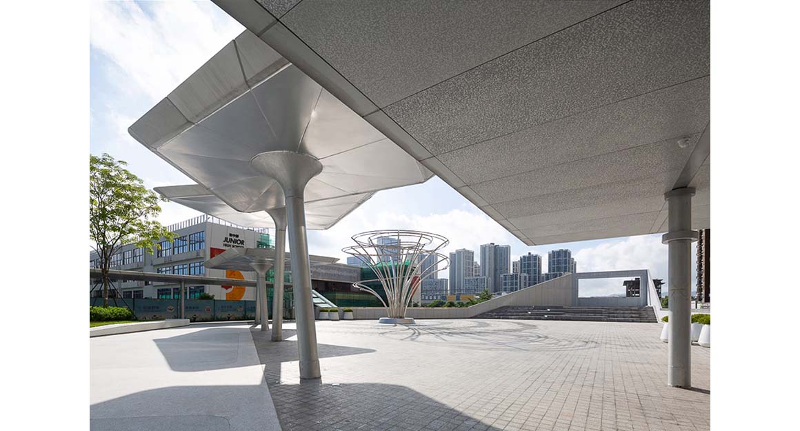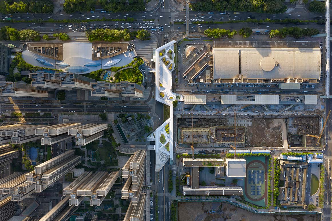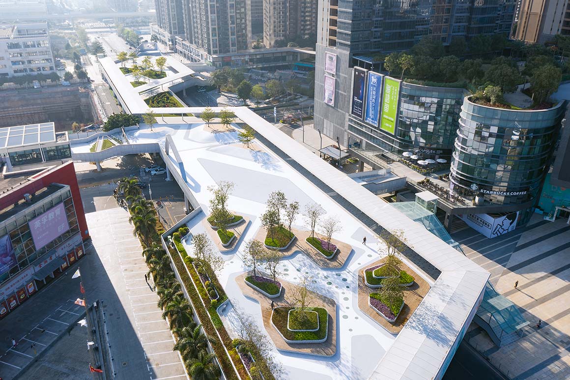 Project: Floating Archipelago — Pedestrian Bridge Design / Location: Longgang District, Shenzhen, China / Architect: FCHA / Architecture and Landscape design: FCHA / Partner in charge: Zetao Chen, Jinlefu Su, Zhiwei Lu / Project manager: Zhiwei Lu / Design team: Wenlong Jiang, Zhiyi Liang, Chenhua Yu, Lipeng Zou, Jun Zhou, Lijin Huang, Yuanwei Liu, Zhenhon Lei, Jiawei Feng, Hao Wu / Landscape construction drawing: Shenzhen Yuanye Environmental Design Co., Ltd / Lighting deepening design: Shenzhen lighting formula technology Co., Ltd / Steel structure coordination: China Academy of Building Research / Construction drawings: China Academy of Building Research / Curtain wall deepening design: Dadi Curtain Wall Technology Co., Ltd / Sculpture deepening design: Shenzhen Choushi culture Communication Co., Ltd / Client: Vanke(Shenzhen) & ICITY / Gross built area: 10,000m² / Design: 2017 / Completion: 2020 / Photograph: ©Tianpei Zeng (courtesy of the architect)