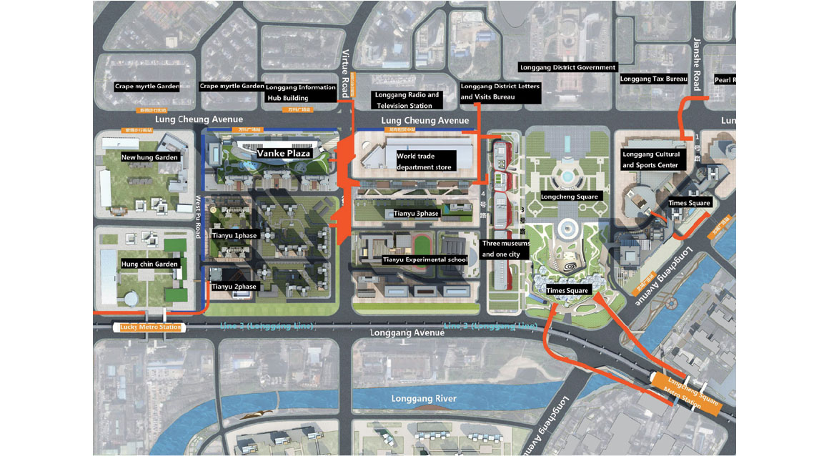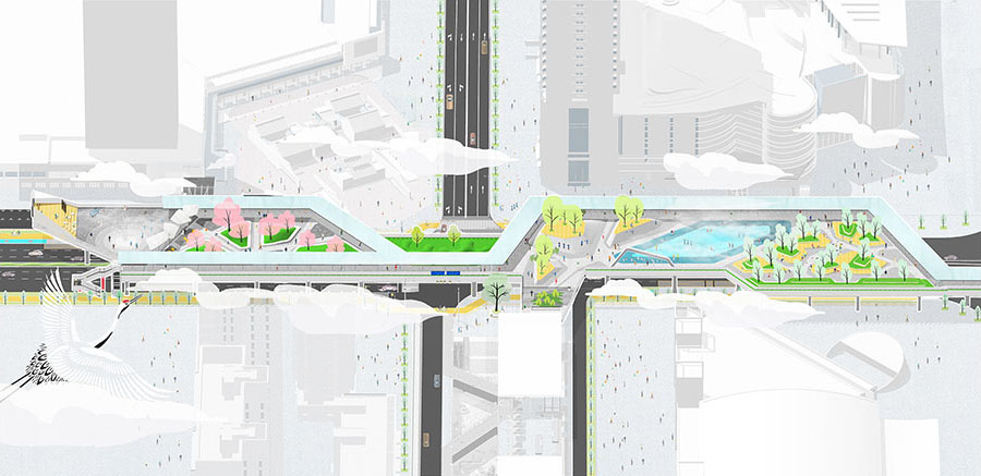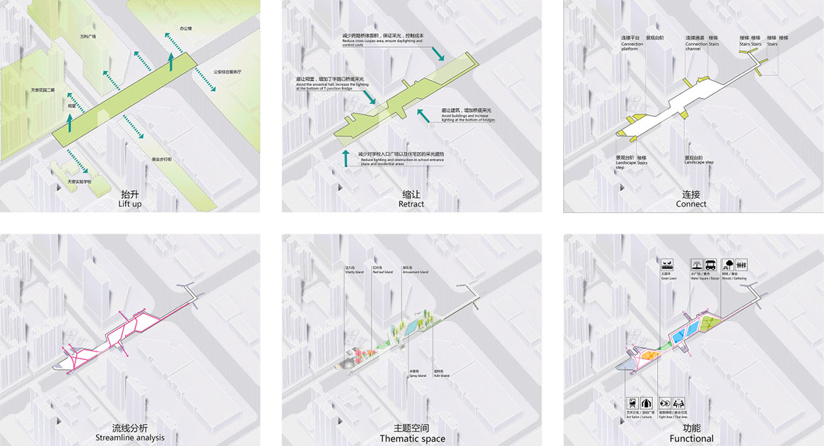 In Shenzhen’s Longgang District, bridges form part of the traffic system plan. The no.2 bridge integrates architecture and landscape with the concept of “floating Islands”. It connects the Vanke Plaza Commercial Complex, the World Trade Department Store, Tianyu Phase II residential area, and a commercial pedestrian street. Floating above Dezheng Road and across Longxiang Avenue, the bridge is a two-story landscape corridor connecting multiple platforms. The density of people flow in the base is large, the streamline is complex, and the current situation is mixed. There is a lack of civic activity space around the base, and most of the surrounding park space is dominated by natural landscape. The new elevated corridor space establishes an urban leisure facility and solves traffic problems.