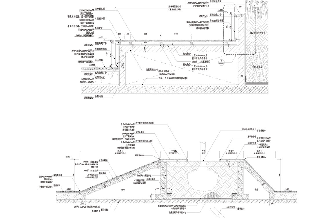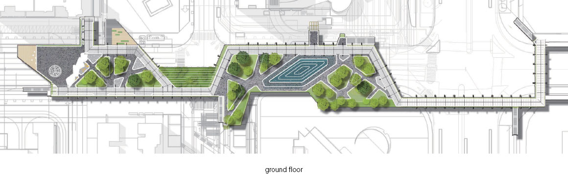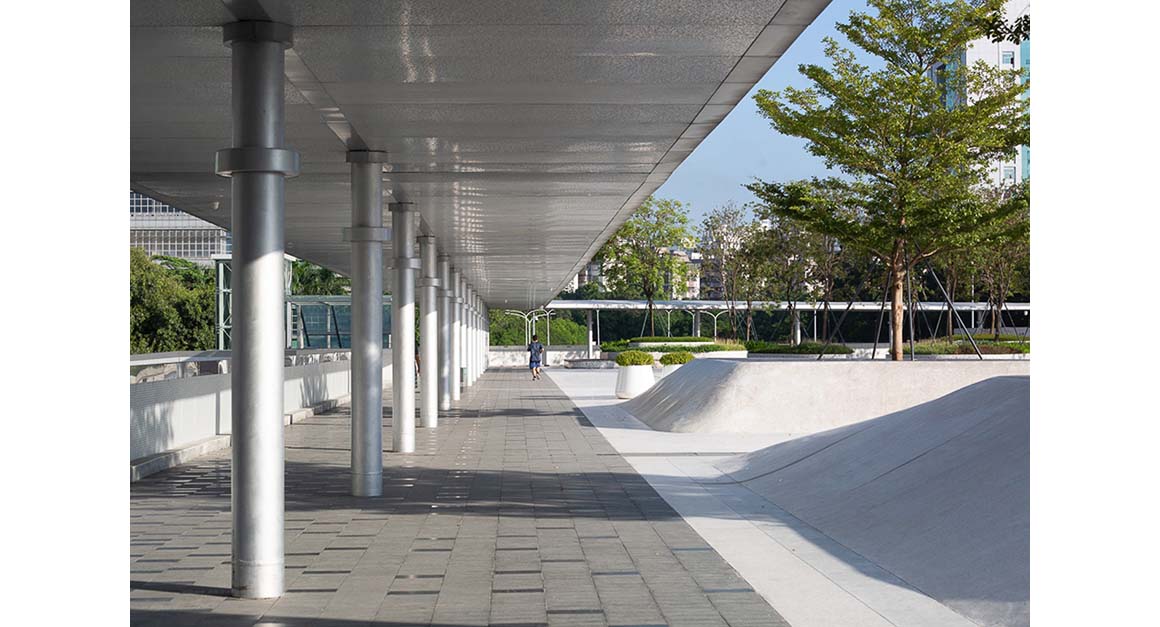 There is a continuous canopy on the whole bridge deck, which connects the main lines of circulation in series and is accessed by stairs and elevator. The canopy provides shading and rain protection. The south end is marked by a metal sculpture tree with spray lighting effect that winds upwards.