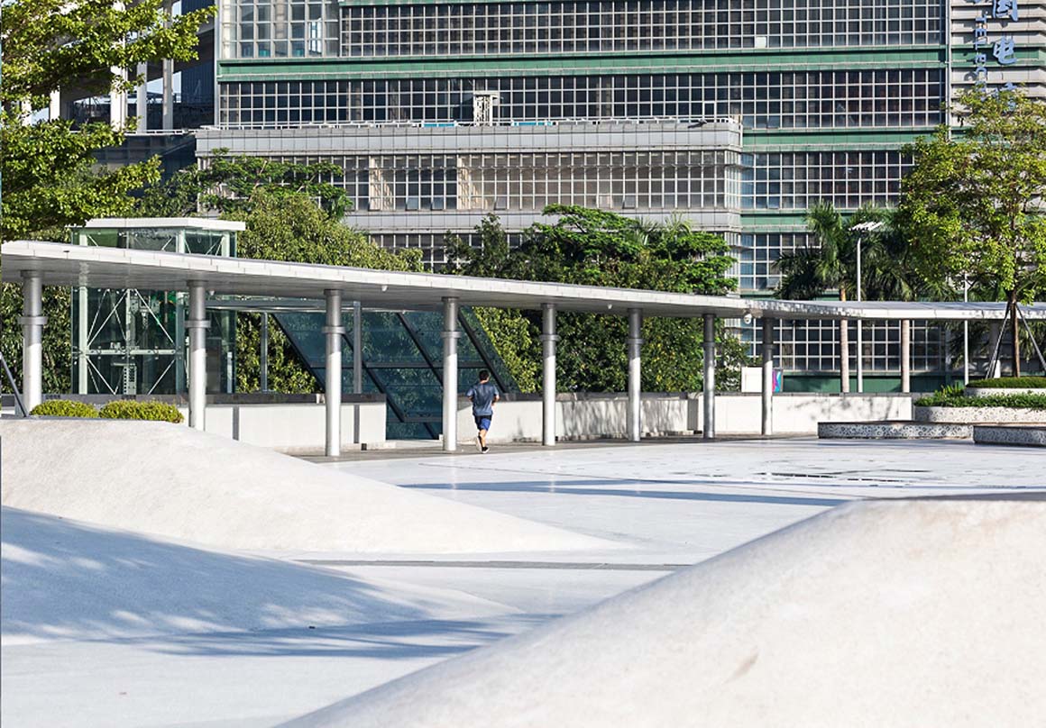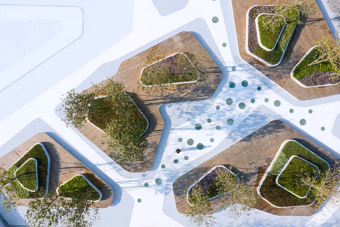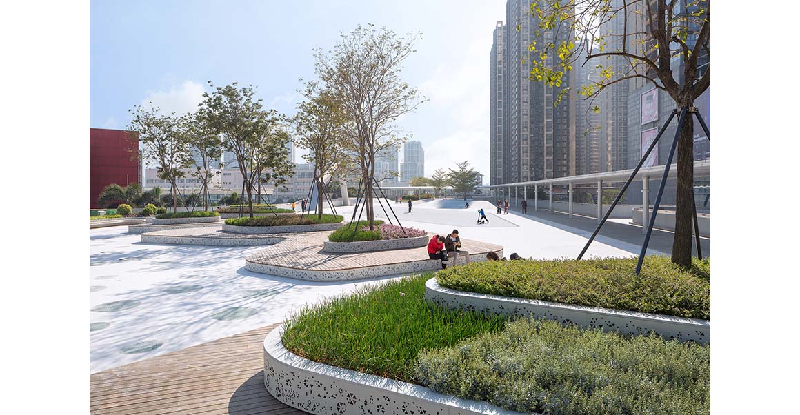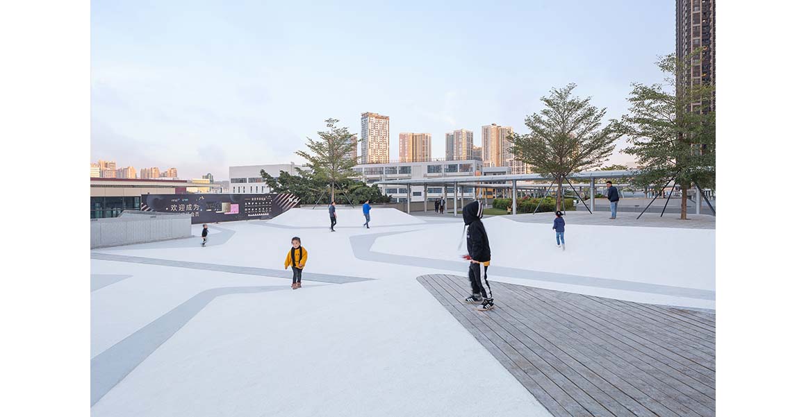 Pleasure island combines trees with raised mounds to create a pure landscaped sculptural feeling. Terrazzo and plastic wood are used to create a place of slopes suitable for children and young people to run and play, and attract roller skating, skateboarding, cycling and other activities.