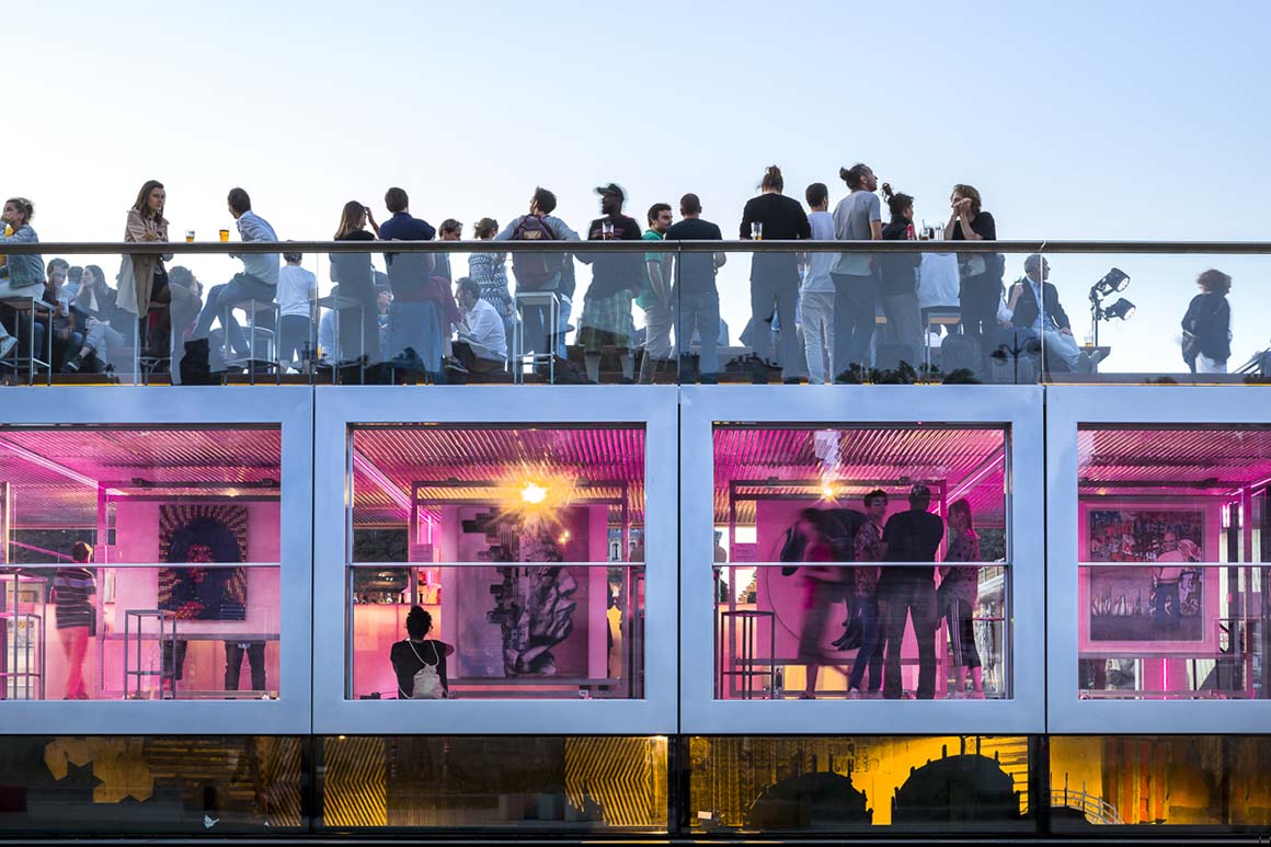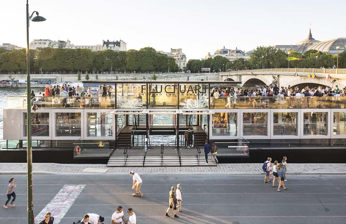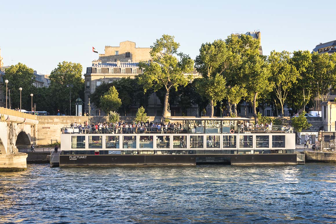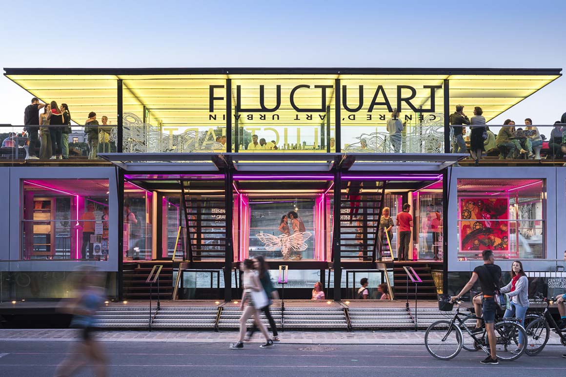 Fluctuart is a three-story floating structure, moored on the banks of the River Seine, and home to a gallery of street art, bar, café and cultural space.