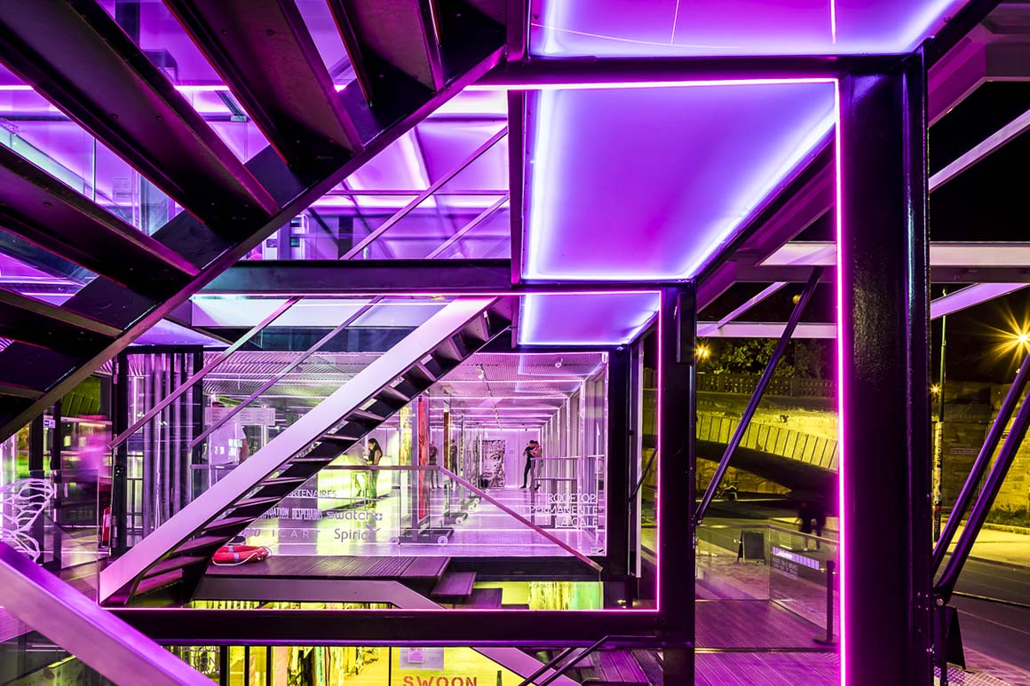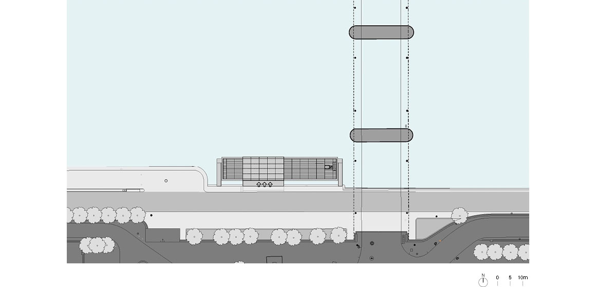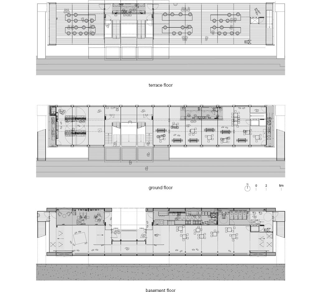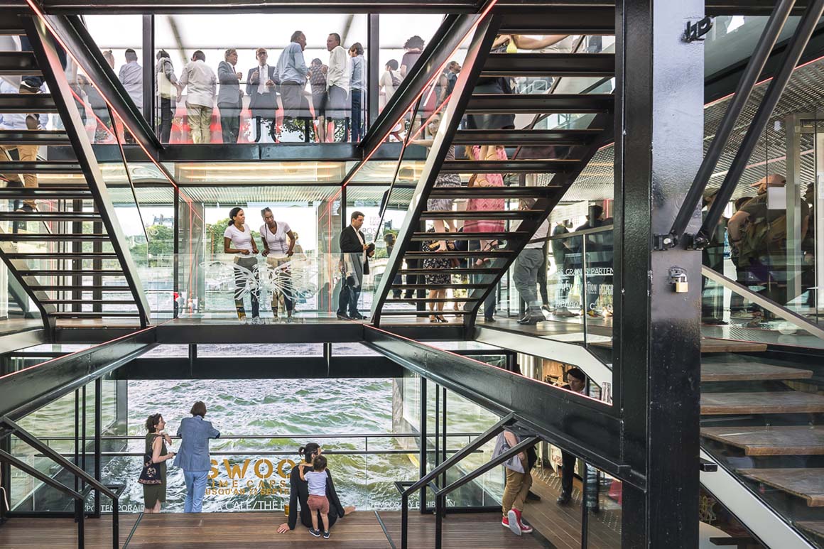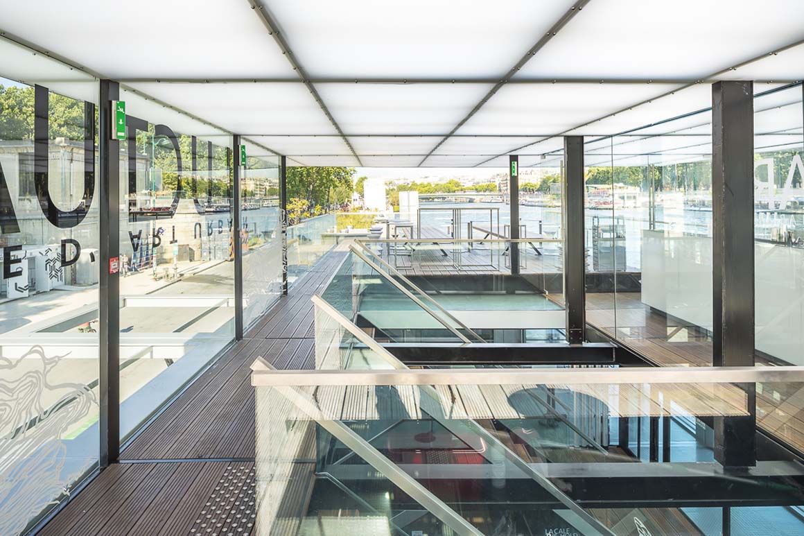 The design of the façades is inspired by, and contains references to, details found in the architecture around ports. It is a floating barge, in pure steel, resembling the vessels which transport containers. These modules form a simple and repetitive rhythm. The whole is modular, articulated and transparent.