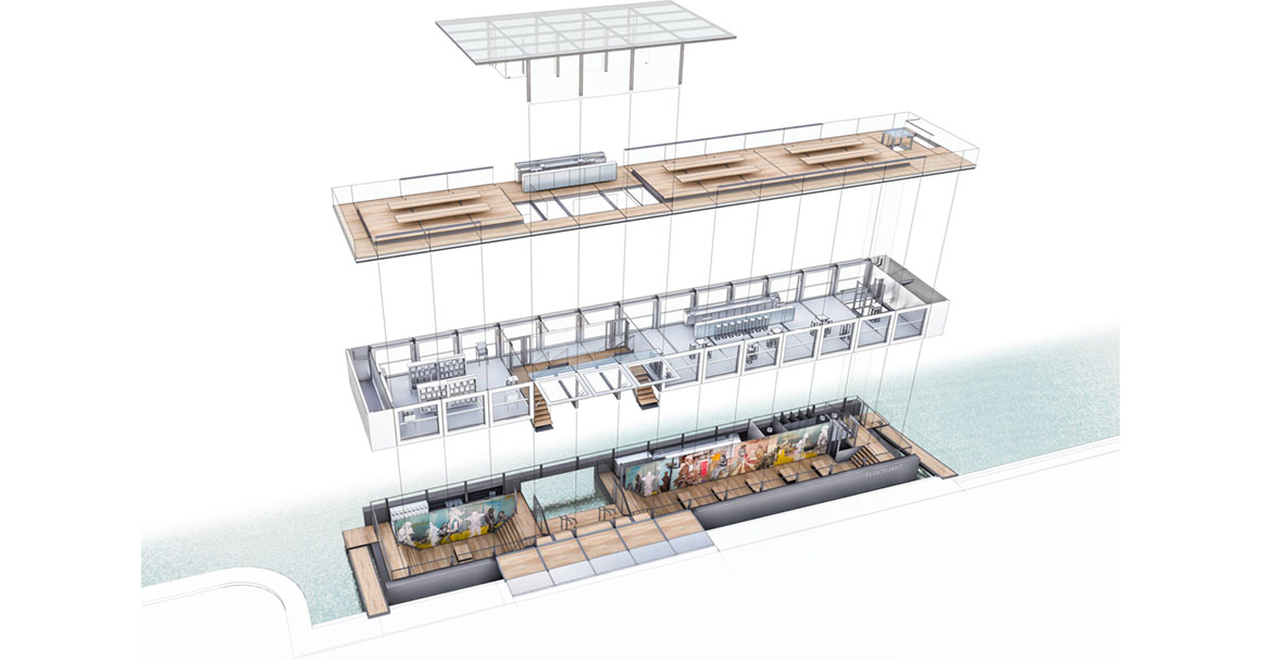 The main concept of Fluctuart is to allow the water from the River Seine to flow into the heart of the building: to enable this strong concept to work, the architects literally opened a hole in the shell.