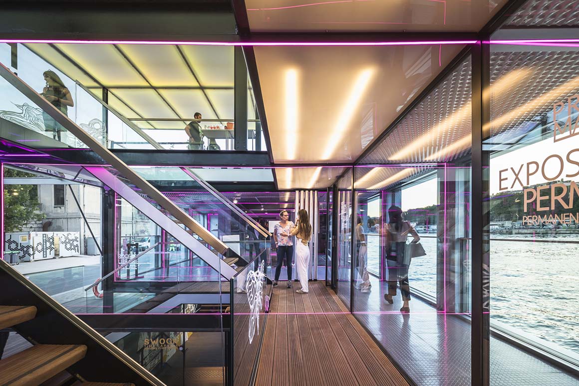 Project: Fluctuart Urban Art Center / Location: Port du Gros Caillou, 75007 Paris, France / Architects: SEINE DESIGN / Lead architects: Gérard Ronzatti, Matthieu Ronzatti / Program: gallery of permanent art collection, exhibition spaces, bookstore, offices, panoramic rooftop and a central patio / Client: Private investor – Boursin, Philippon et Laugero / Area: 850m² (including 148m² technical installation space) / Competition: 2016~2017 (winner) / Construction: 2018~2019 / Completion: 2019.7 / Photograph: ©Sergio Grazia (courtesy of the architect)