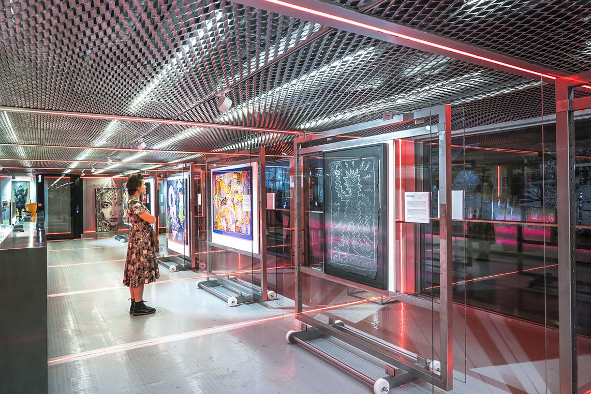 This modularity is transformed into a frame that organizes the entire interior layout, both the implementation of materials and lighting, and the design of all furniture including the supports for the works of art. The interaction between lighting and framing plays with perspective, and offers a sensation of infinity.