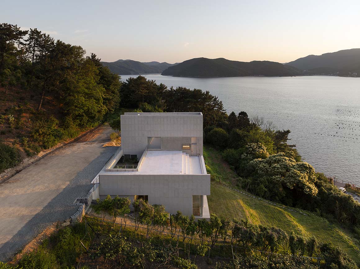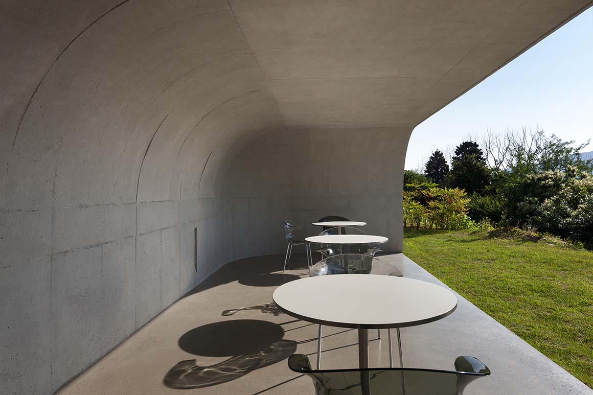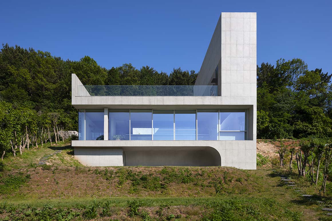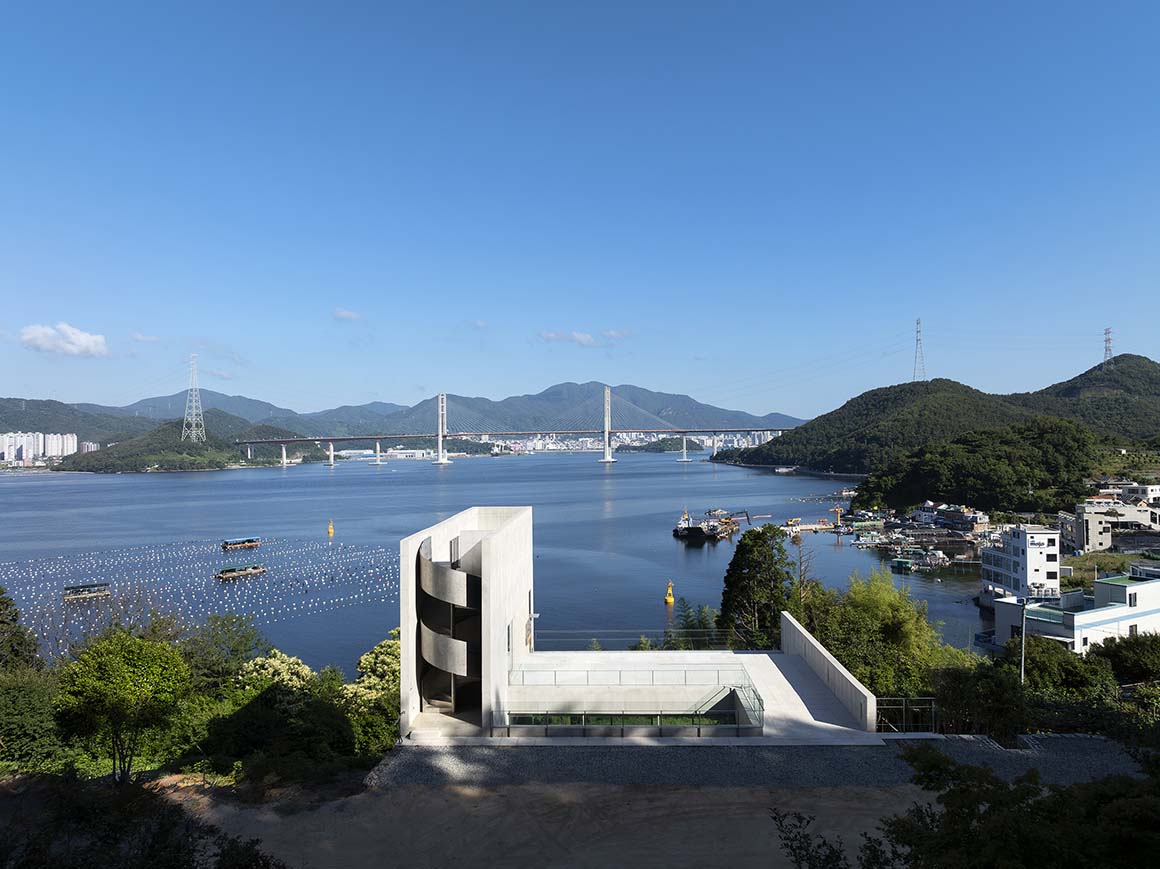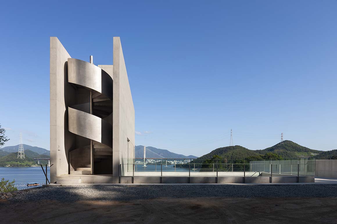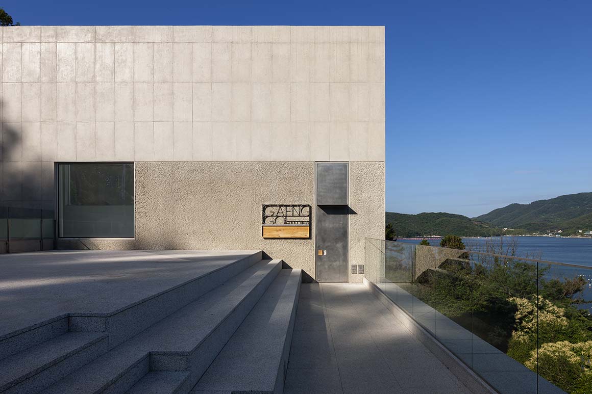 At the dead end of a coastal road in Geoje, GAENGGO BANJIHA sits low, crouching against the earth. Concealing its true form, it presents a massive concrete wall and a spiral staircase that intentionally obstructs the view of the sea. The moment expectations of an open vista are subverted, one’s dulled everyday senses are suddenly sharpened.