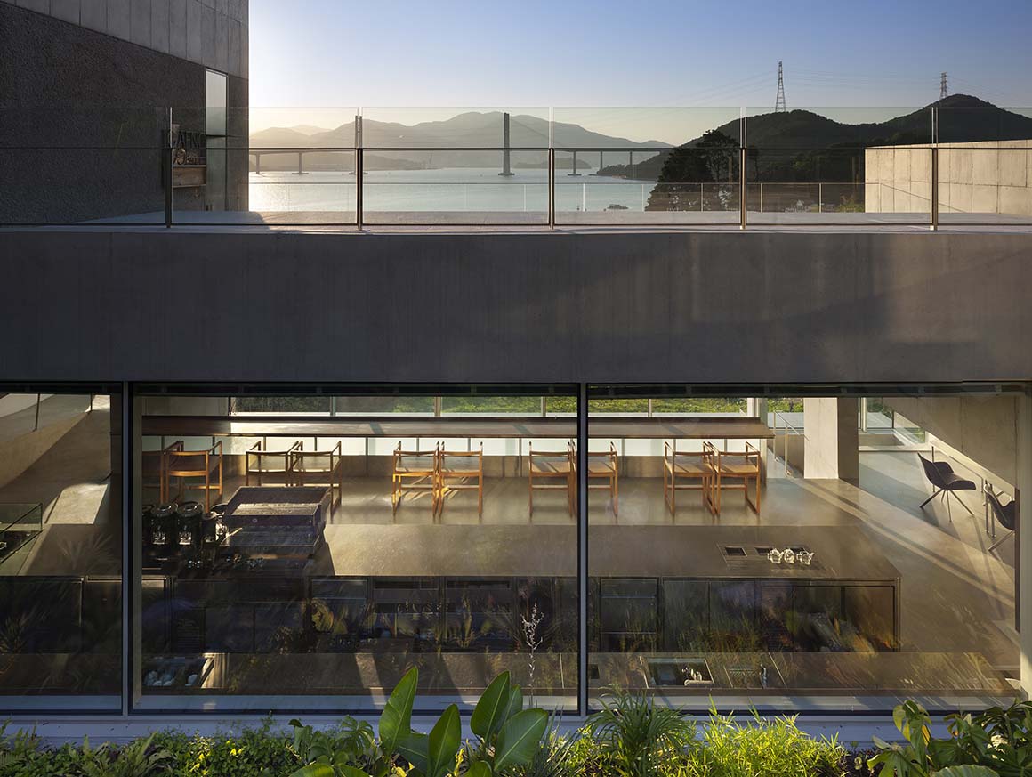 Looking downward, a sunken garden carved deep into the ground reveals itself. Extending the gaze across this void, layers of activity emerge: the rhythmic bustle of the kitchen and guests enjoying their coffee, framed against the sloping dunes and the sea beyond. Unlike conventional buildings, this descent into the earth creates a profound layering of scenery, initiating a sensory immersion into the site’s unique identity even before entering the space.