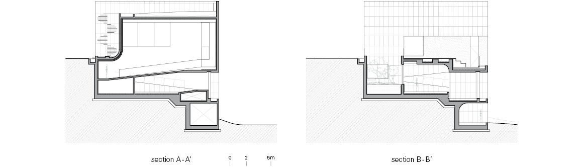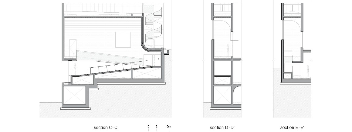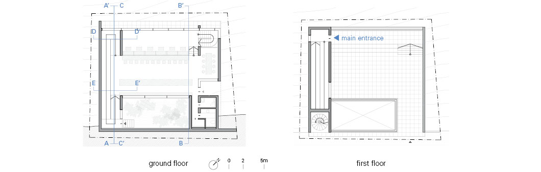 Project: Gaenggo Banjiha / Location: 530, Samgwi-ro, Seongsan-gu, Changwon-si, Gyeongsangnam-do, Republic of Korea / Architect: eSou Architects / Project team: Hyejin Kim, Jueun Lee, Dakyeng Lee, Seungjin Park, Jeongbin Choi / Contractor: Byeongguk Gwon / Use: neighborhood living facilities / Site area: 330m² / Bldg. area: 182.10m² / Gross floor area: 224.97m² / Bldg. coverage ratio: 55.18% / Gross floor ratio: 57.04% / Bldg. one story below ground, two stories above ground / Height: 11m / Parking: 2 cars / Structure: RC / Finishing: EuroForm exposed concrete / Design: 2020.11~2021.9 / Construction: 2022.10~2024.2 / Completion: 2024 / Photograph: ©Youngchae Park (courtesy of the architect)