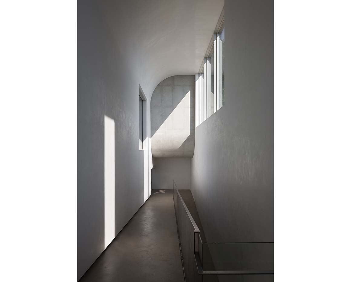 The journey continues inward. A long ramp begins at the entrance, leading toward the main hall in a single, uninterrupted flow. There is no need for conscious navigation; one simply follows the tilt of the floor and the guidance of the heavy walls. As one moves, the intensity of light through high windows, the solid texture of the ramp underfoot, and the resonance of music against the walls naturally settle into the visitor’s consciousness.