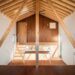 Access to the house is through a sheltered patio, providing protection from the wind while still allowing a view of the sky—a transitional space connecting the exterior and interior. From there, one enters a double-height living area housing a living room, an open kitchen, and a dining room. Two bedrooms complete the first floor. The second floor via a glass staircase features a spacious bedroom and its bathroom.