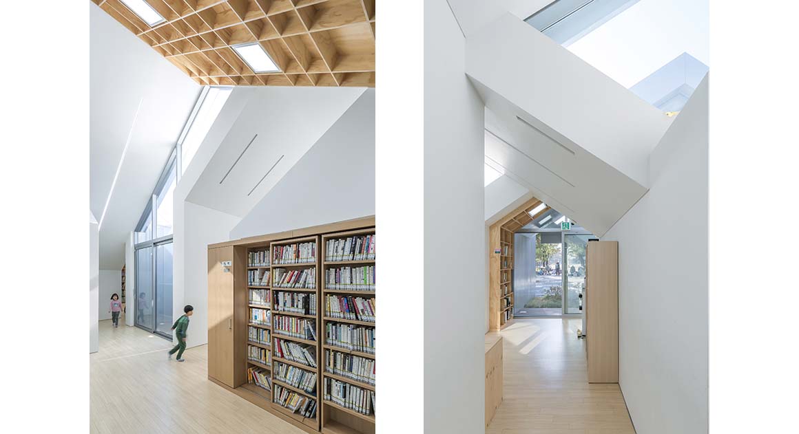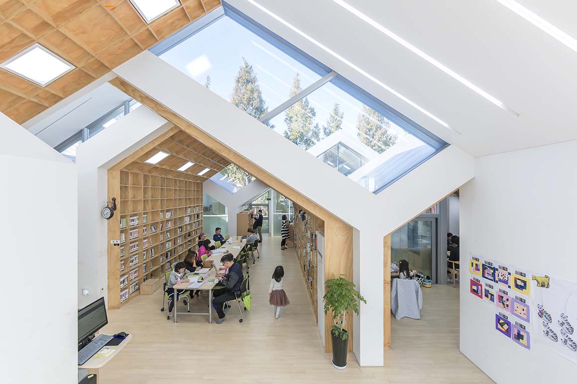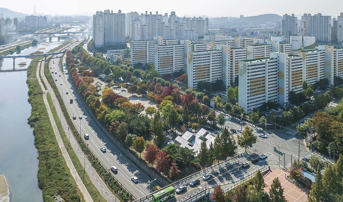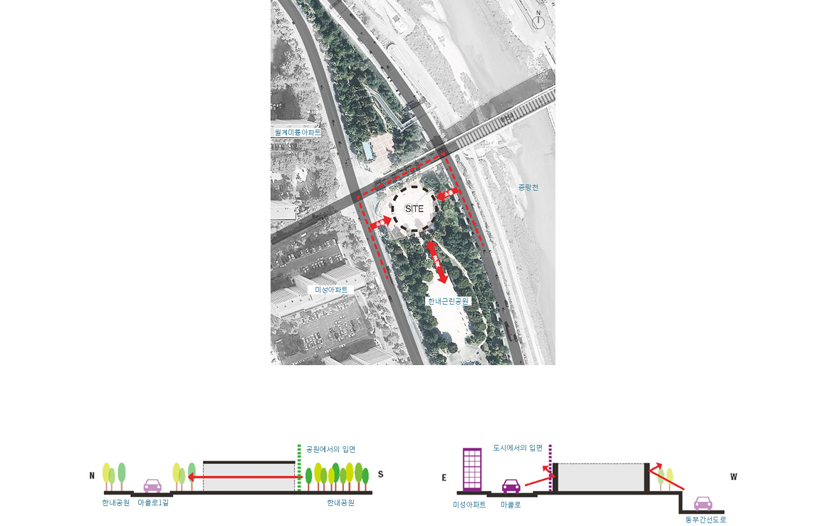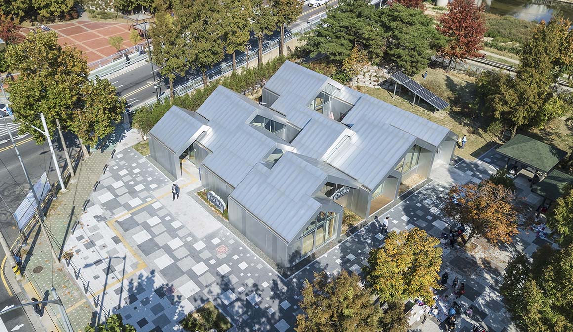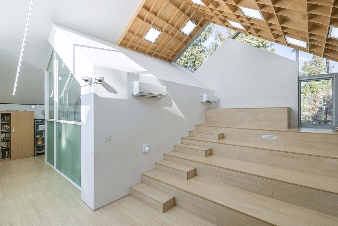 The site of this community facility is located near the entrance to a neighborhood park, built on the side of Jungrang-cheon stream. The fountain on this site remained broken for a long time, and the fragmentation of the local residents, and the condition of the park, was getting worse. Despite the high density of the residential area, there was no communal, cultural space for the inhabitants and their children. Hannae Forest of Wisdom was proposed as a solution – to act as a vehicle which combines local culture with the nature-park, and so to revive and revitalize the abandoned site.