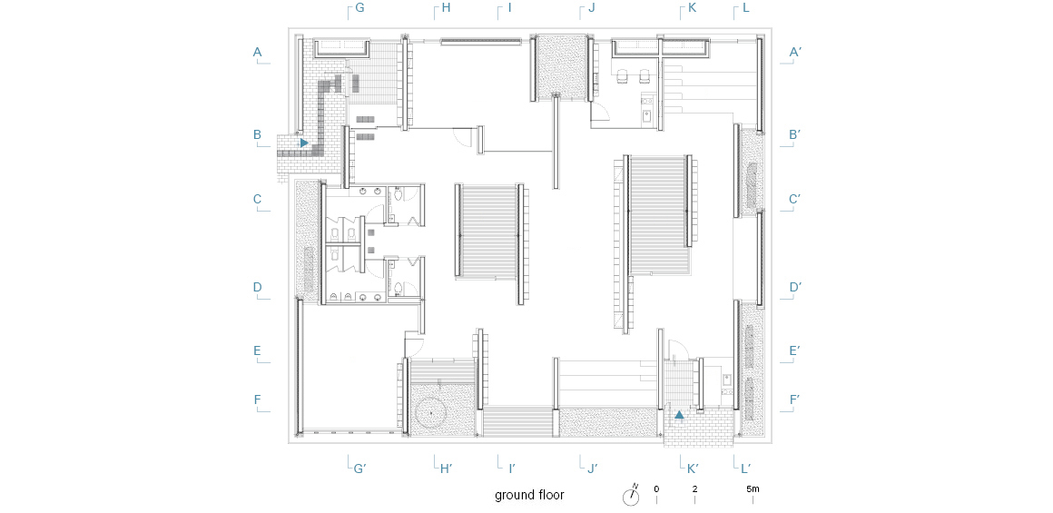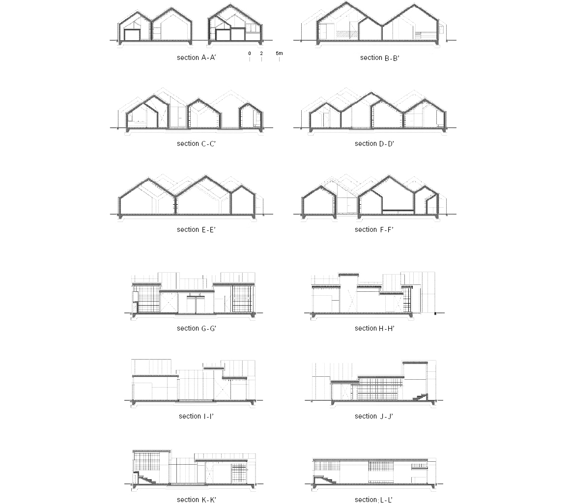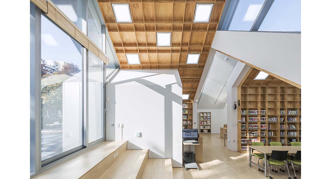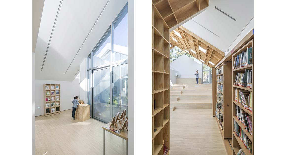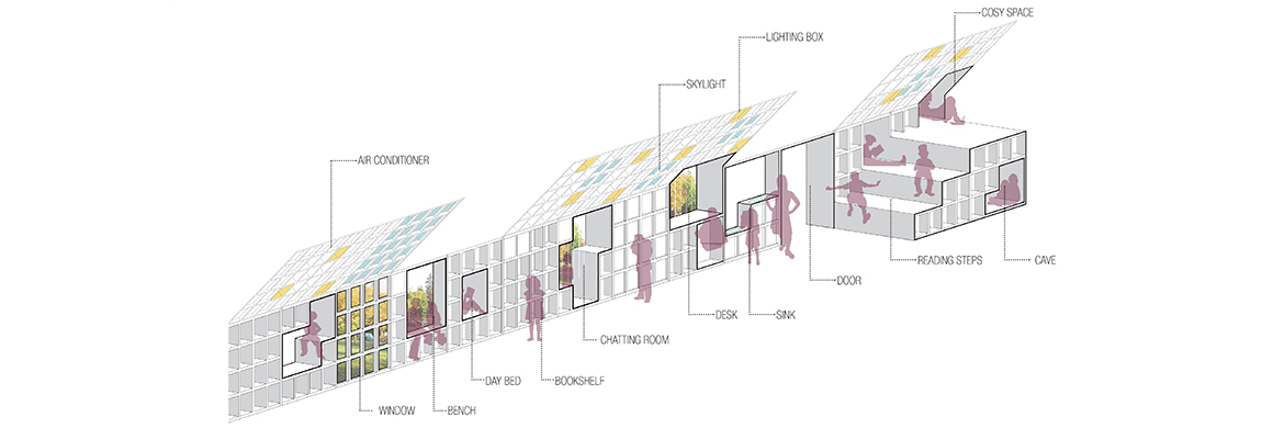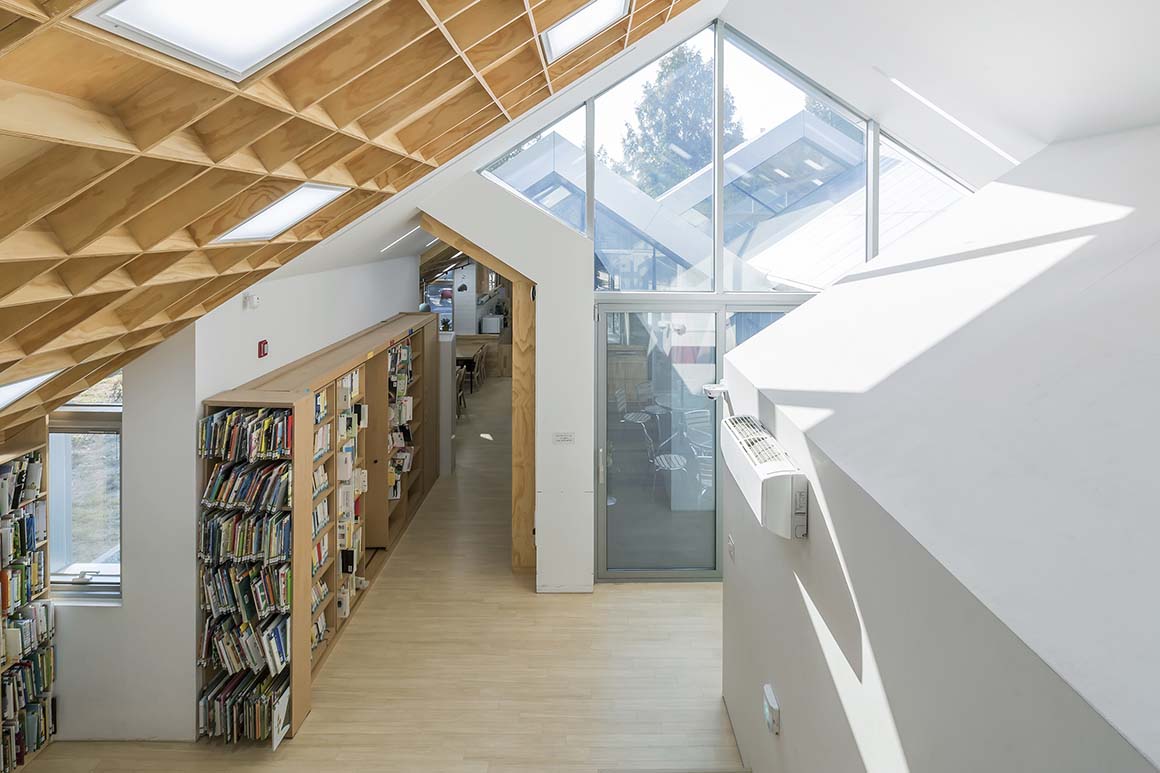 The interior is as unique as the outside; both arouse the visitors’ curiosity. The basic unit of space is a bookshelf which acts as an interior wall. Whereas, typically, walls only divide space, bookshelves incorporate space. In other words, the bookshelf-wall is a dual structural element where integration and division coexist.