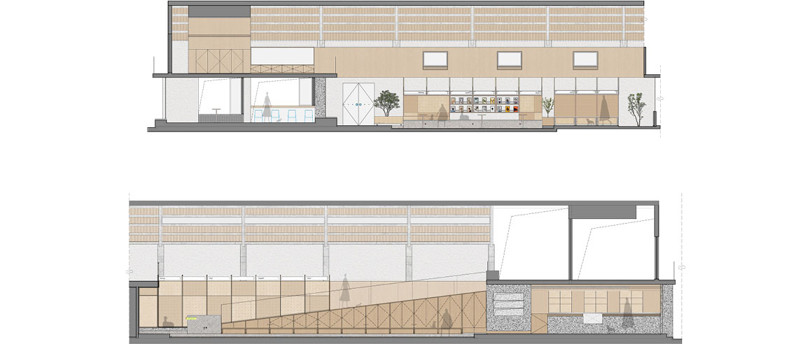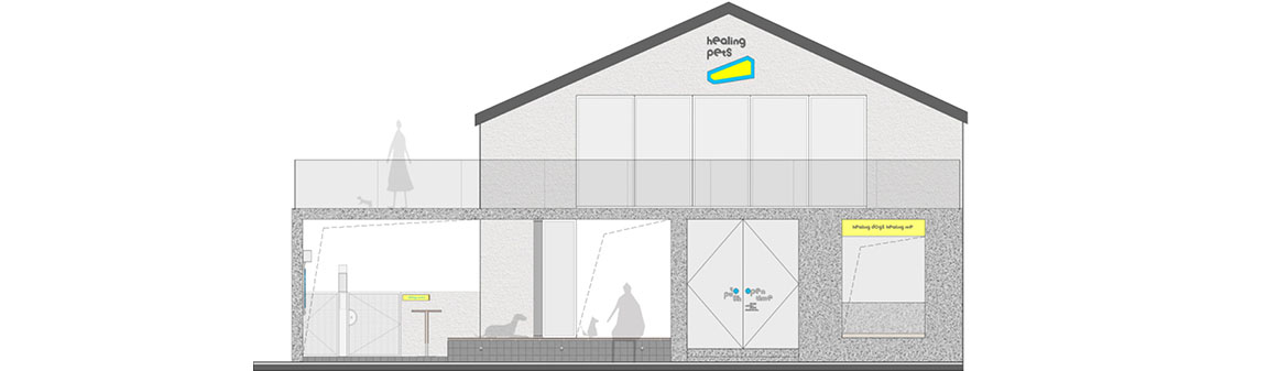 The central space, preserved from the original structure, is connected by a ramp spanning the first and second floors. Pets and their owners move up and down as if strolling along a gentle hillside, while light filters in from above, marking the passage of time from morning to dusk. Deeper inside, the program spaces take the form of stacked square volumes. The first floor houses a pet hotel and grooming facilities, with flexible glass partitions that allow the spaces to be reconfigured as needed. On the second floor, offices overlook the entire interior, enabling seamless communication and management.