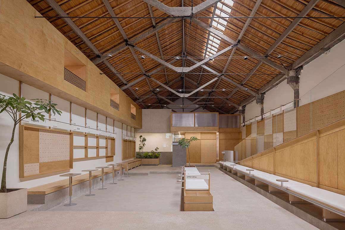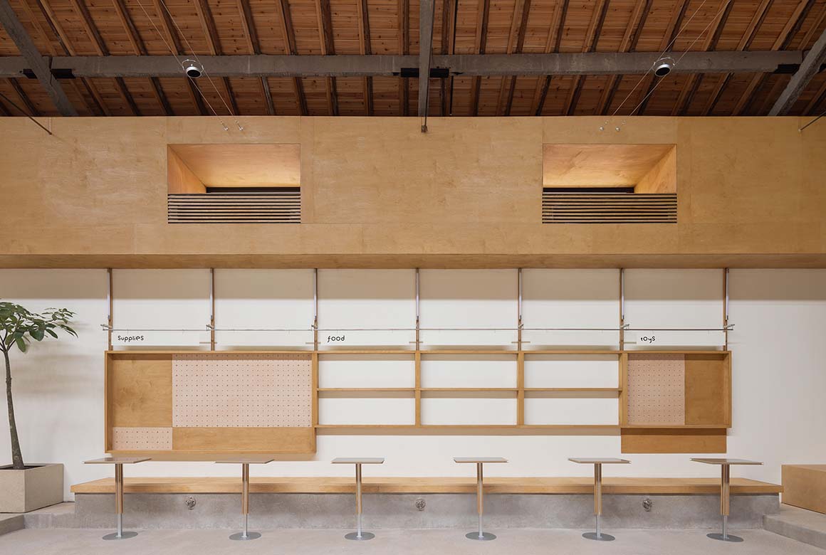 A palette of tactile, natural materials—including washed stone finishes, exposed aggregate concrete, textured paint, and marine-grade panels—adds vitality to the space. Rough-washed stone used for the interior bar, seating, and flooring forms a restrained backdrop, while exposed aggregate concrete floors and gray-toned stone walls resonate with one another to create an outdoor-like atmosphere. These coarse textures provide surface friction, preventing pets from slipping and making stains less noticeable—an important practical consideration. Wall systems and modular furniture are constructed using warm-toned marine-grade panels that harmonize with the existing timber roof structure. Over time, weathering will further enrich the character and depth of these materials.