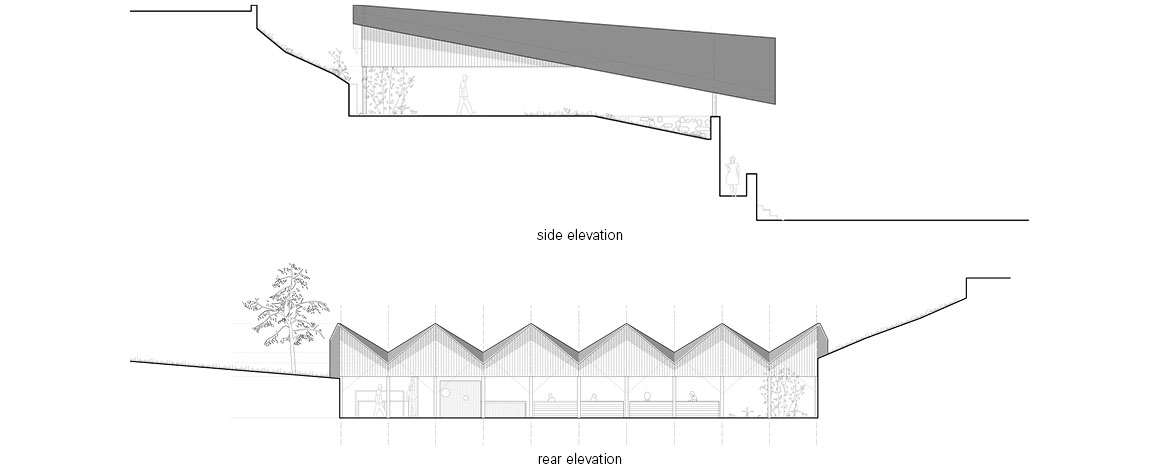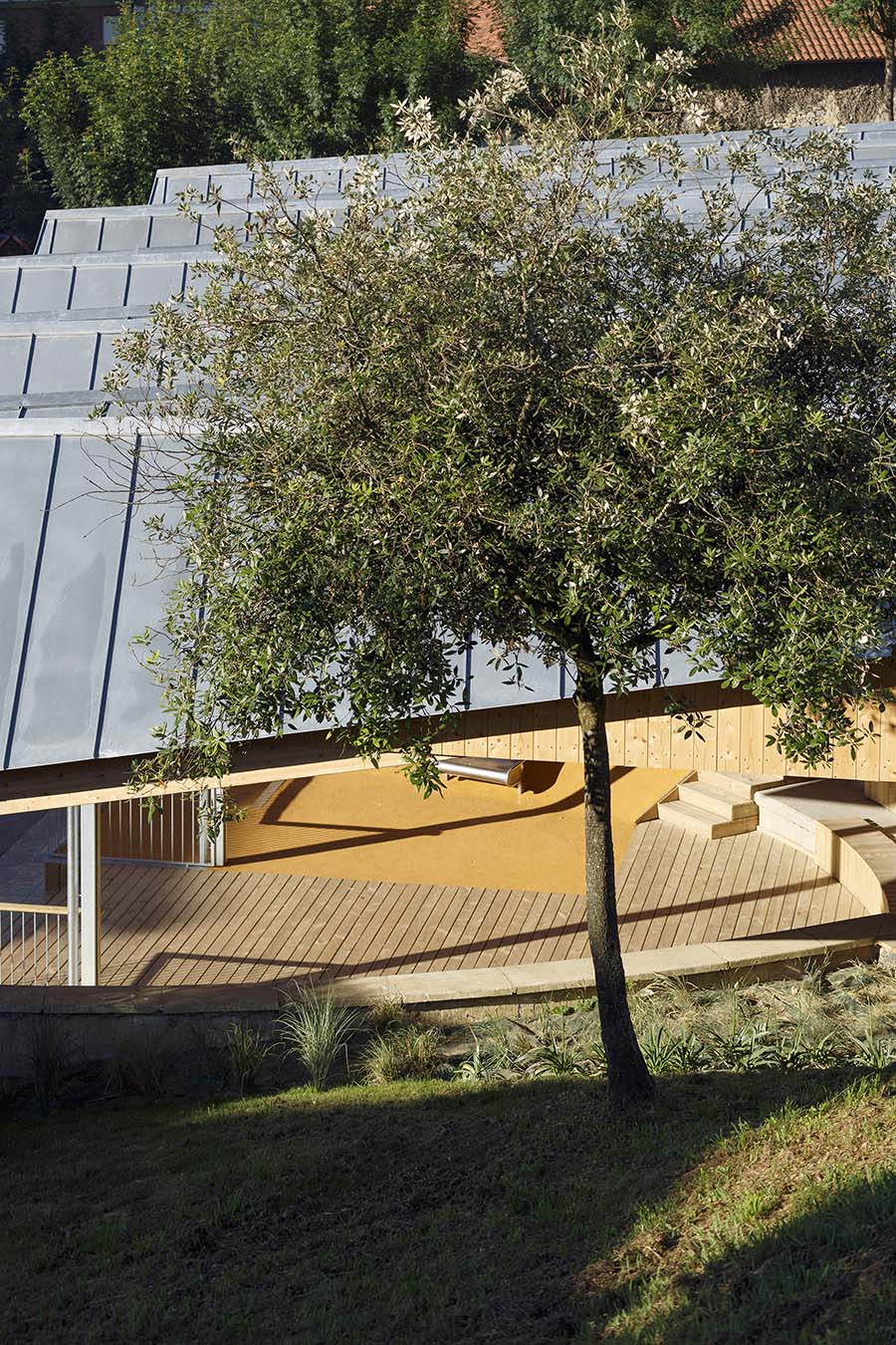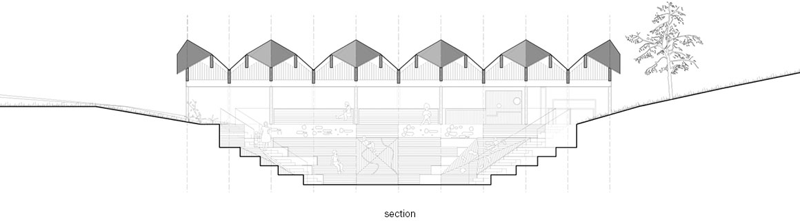 Consequently, the upper zone is intended for health and sports uses with priority given to gymnastics for the elderly. The bleachers have a double function: on the one hand, as and improved, comfortable rest and control area for infants, and on the other, as seating for the public during shows.