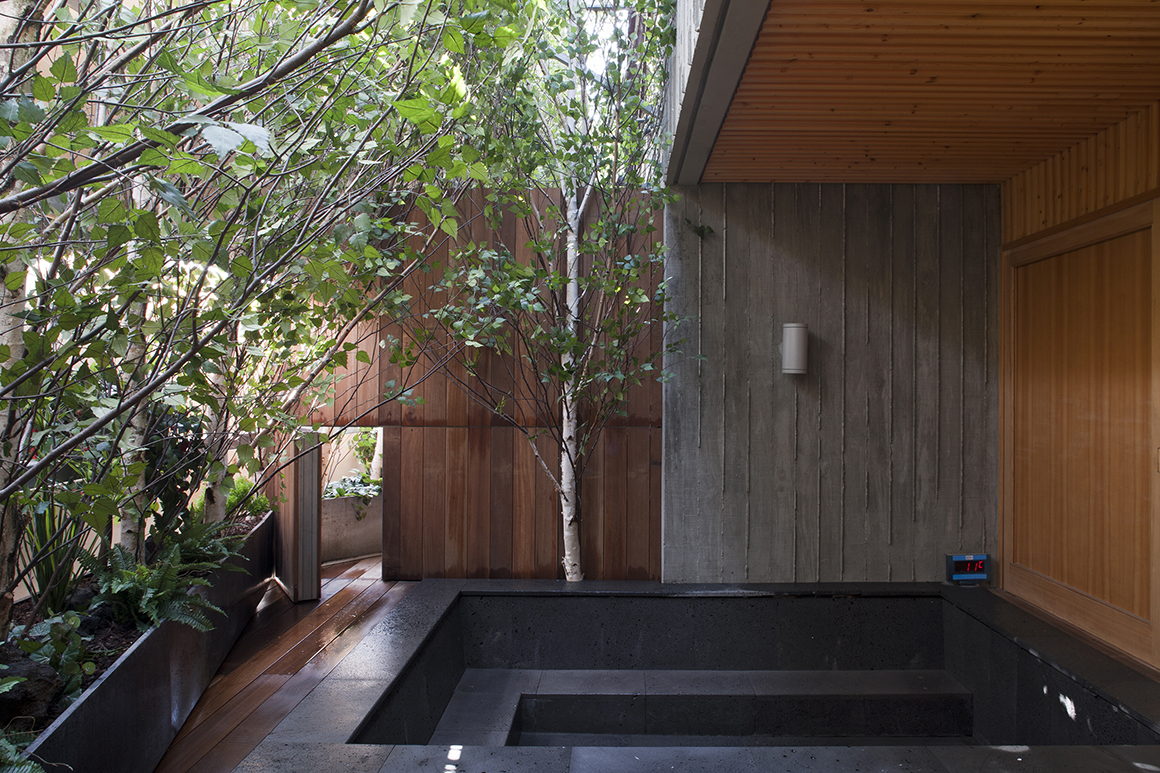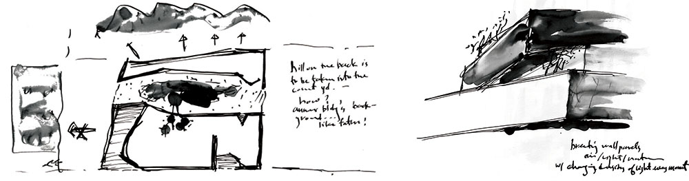 Juxtaposing the exposed concrete facade of the theatre, the hotel is defined by four geometric ‘ribbons’, wrapping the building to create a multitude of transitional spaces, allowing the guests privacy and a unique experience of the surrounding natural environment. On the upper level this overlap of the façade creates courtyards for moon viewing and relaxation in complete privacy – this experience further enhanced by built in hot tubs. The deck is intended to be extensively used becoming an area that allows the control of light and air entering the building. The glistening façade is composed of a series of ceramic panels, supported by a lightweight steel frame, rendering a scale to the community. Thus, these simple gestures turn an otherwise monumental architectural typology into one of humanistic sensibilities, finding ways to still grant the user an isolated experience of nature in a rapidly urbanising setting.