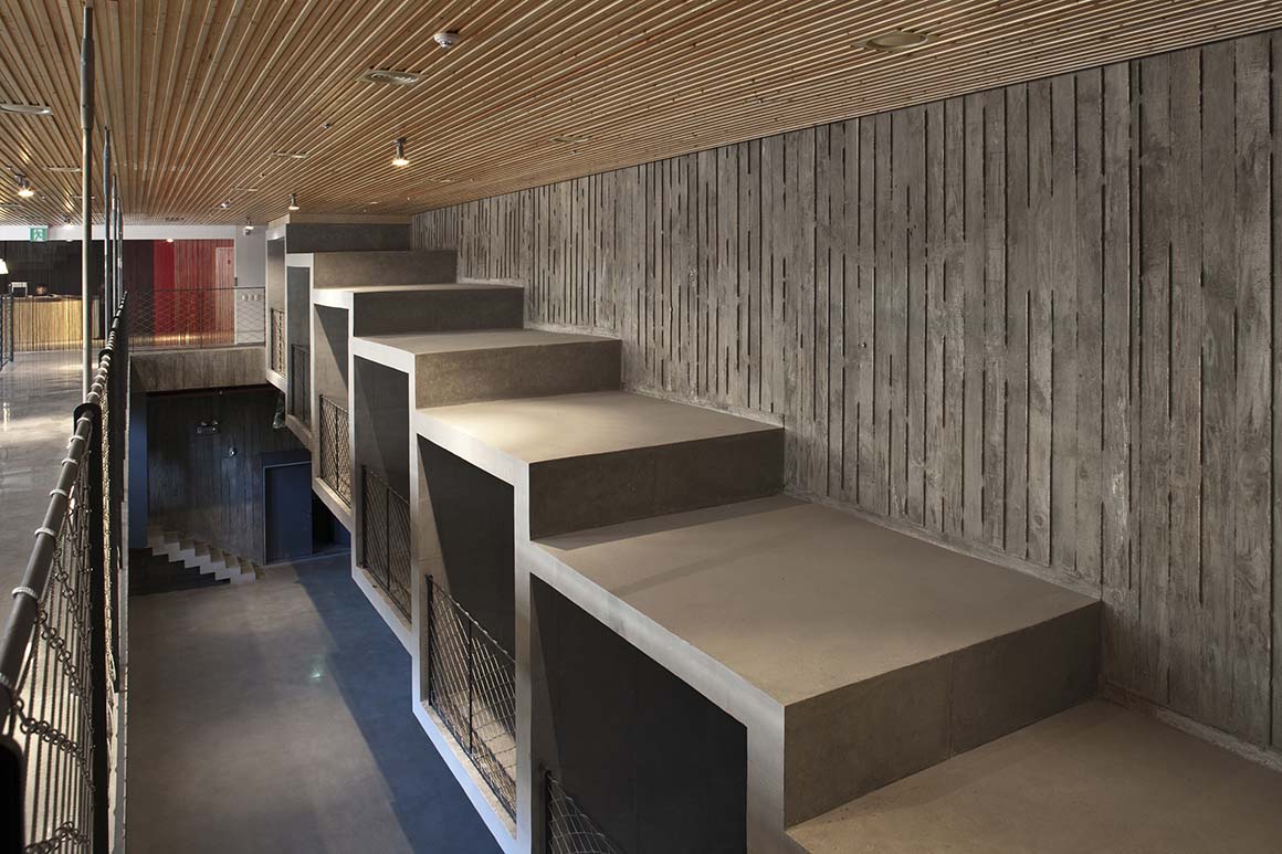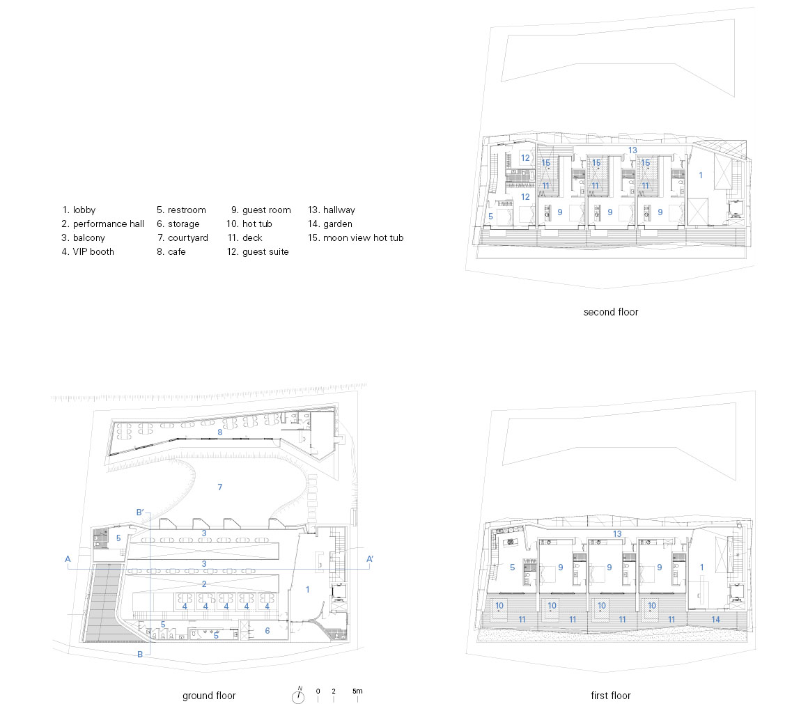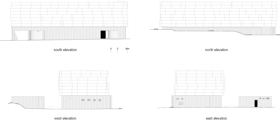 Programmatically, the theatre hosts diverse performances from young experimental acts through to seasoned musicians and performing arts. The design of the hall reflects this becoming a flexible, open space measuring 11mx20mx7m and able to accommodate large or small performances. Seven projected boxes frame the main space, stepping down to offer unobstructed views while a suspended catwalk provides an area for the general public to watch performances. Serving the theatre, a linear café opens to the surrounding pine trees while an untouched courtyard connects the two buildings, allowing an interaction with nature.