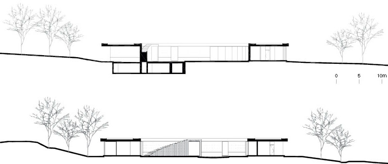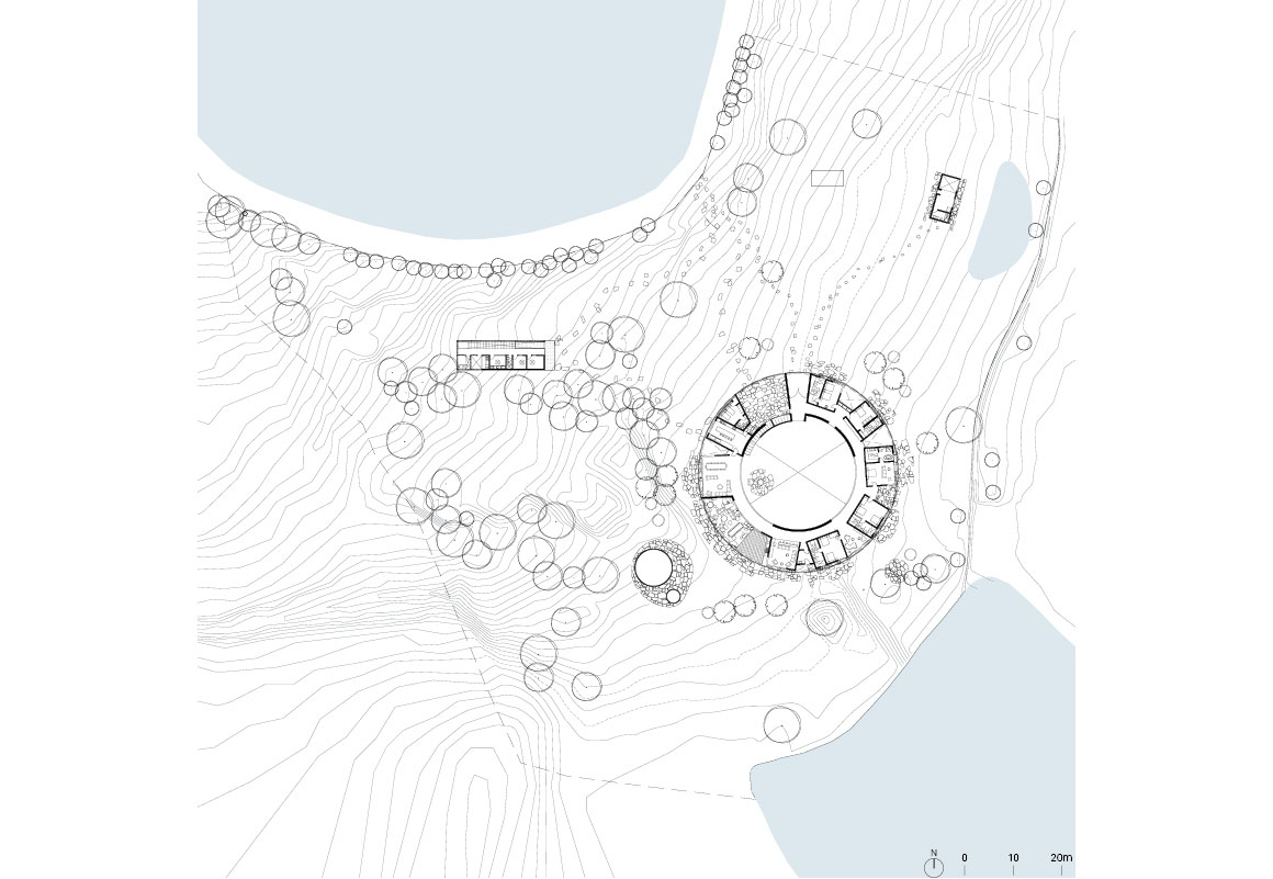 Completed in 2024, the house occupies a site of approximately 8,200m² in La Reserva Peñitas, with a total floor area of 1,115m². Its geometry extends the conventional 360-degree field of vision, recalling a sundial that registers the passage of time through changing light and shadow. Alongside the circular main house are two detached volumes: a studio/guest room and an auxiliary building containing bedrooms and service spaces. This separation accommodates two families and visitors while following the site’s topography and preserving existing vegetation. The house is organized across a ground floor and an open roof terrace. Within the circular plan, rectangular bedrooms, bathrooms, and a kitchen are arranged, while a continuous circulation path runs along the perimeter, extending into terraces facing the courtyard and gardens opening outward. Flexible openings, including large folding windows, connect the interior and exterior.