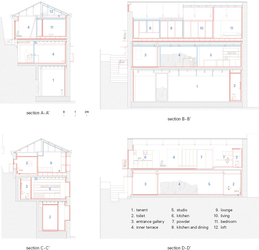 Within the century-old brick masonry and timber structure, a new structure forms a “house within a house.” The old structure functions as the outside, the new as the inside, translating time into space. This unfamiliar relationship draws exterior qualities into the interior. On the third floor, an inner terrace opens generous apertures toward the stone-walled yard beyond the entrance. Windows extend to the floor or open fully, naturally linking the two realms. Brick-toned floor tiles reinforce its exterior quality. The living room, dining area, and bedroom are raised by level changes and fitted with transparent sliding wooden doors, remaining visually connected while prompting spatial transitions and a sense of inwardness. Covered by the umbrella structure, the living room and bedroom become more intimate. The attic occupies an in-between position—between inside and outside, past and present. Accessed by a ladder from the inner terrace, it reveals a view enclosed by the wooden roof structure. On the second floor, beside the rock face that enters the interior, a continuous bench extending from the exterior terrace and sink-like furnishings create a courtyard-like space. Centered on this “courtyard,” a gallery and studio face each other, separated by glass sliding doors and curtains. Owing to the building’s peculiar history, in which interior and exterior systems have become entangled, spatial perception expands without clear boundaries.