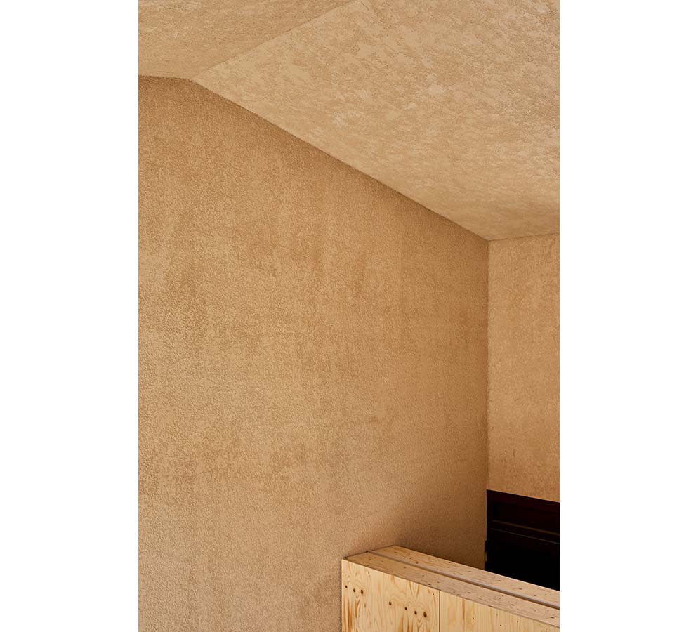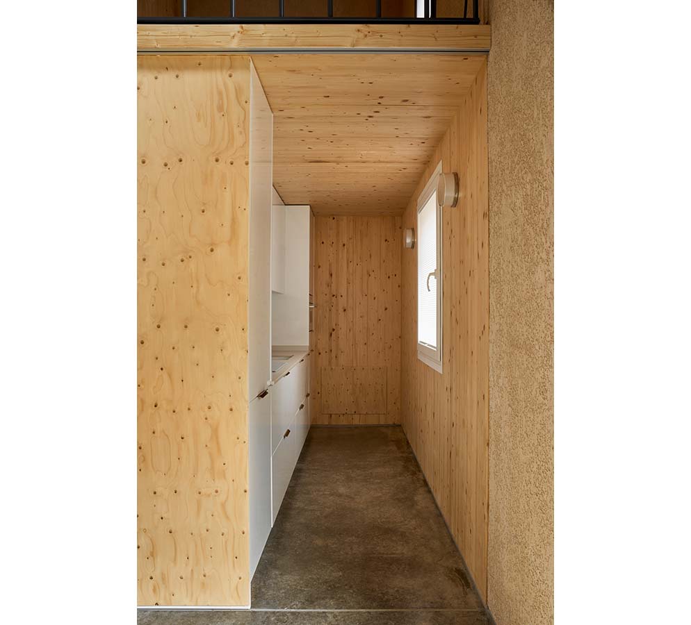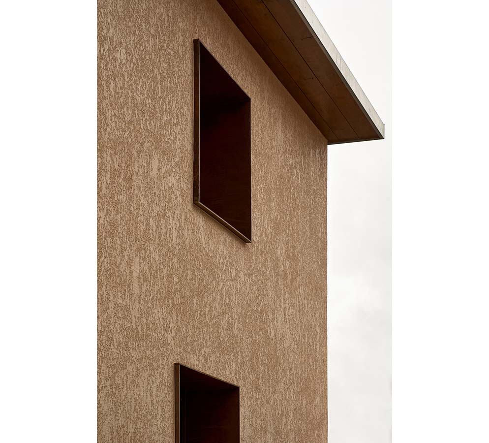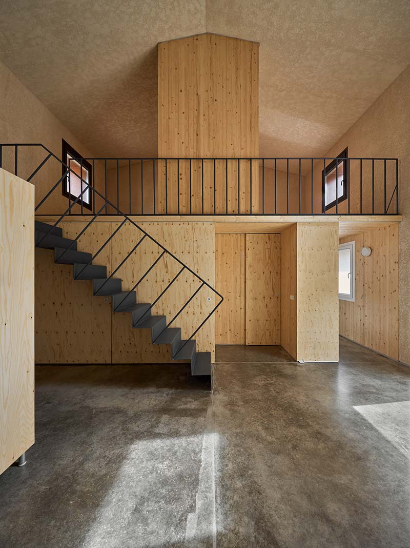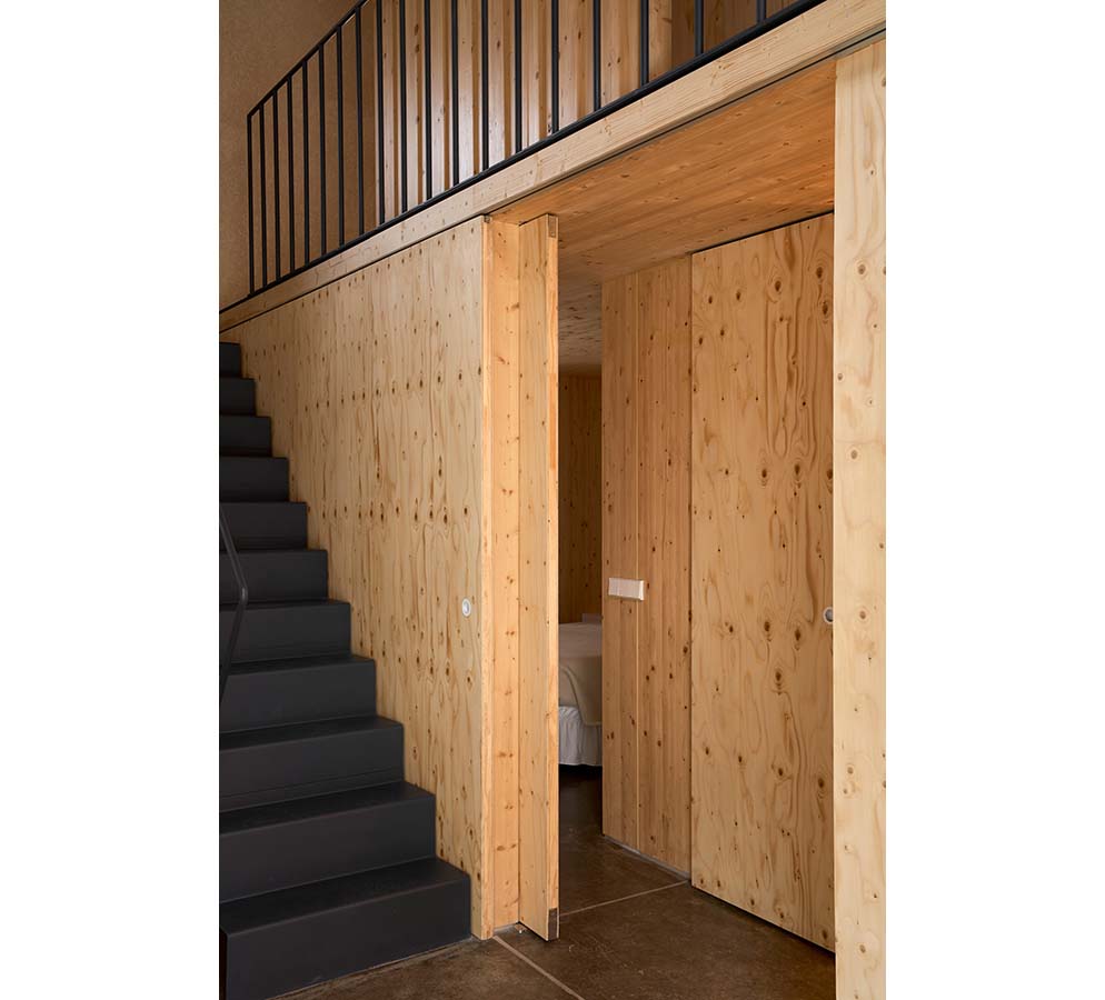 The existing façade, a defining element of the village fabric, was carefully restored. The preserved walls retain the memory of the place while providing a solid frame for new habitation. The interior was completely emptied, and a laminated timber box was inserted within. Partially braced against the outer walls, the box for a living occupies roughly half of the overall volume, establishing a balance between old and new, roughness and warmth, mass and lightness. The resulting interstitial space creates a layered relationship between the retained envelope and the new interior. Rooms are connected or separated by large sliding and hinged doors made from the same timber as the inserted structure, allowing for visual continuity and functional flexibility. Energy performance was also a priority. A continuous insulation layer was added to the inner face of the shell, backed by lightweight partitions and finished with the same single-coat mortar used on the exterior. This ensures thermal continuity and material consistency. The roof was entirely rebuilt in laminated timber, retaining the traditional beam-and-rafter system while enhancing precision and structural stability.