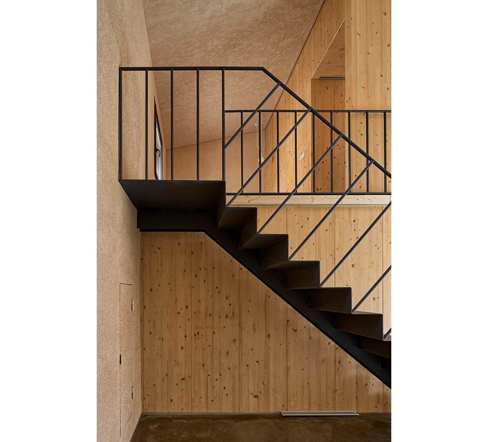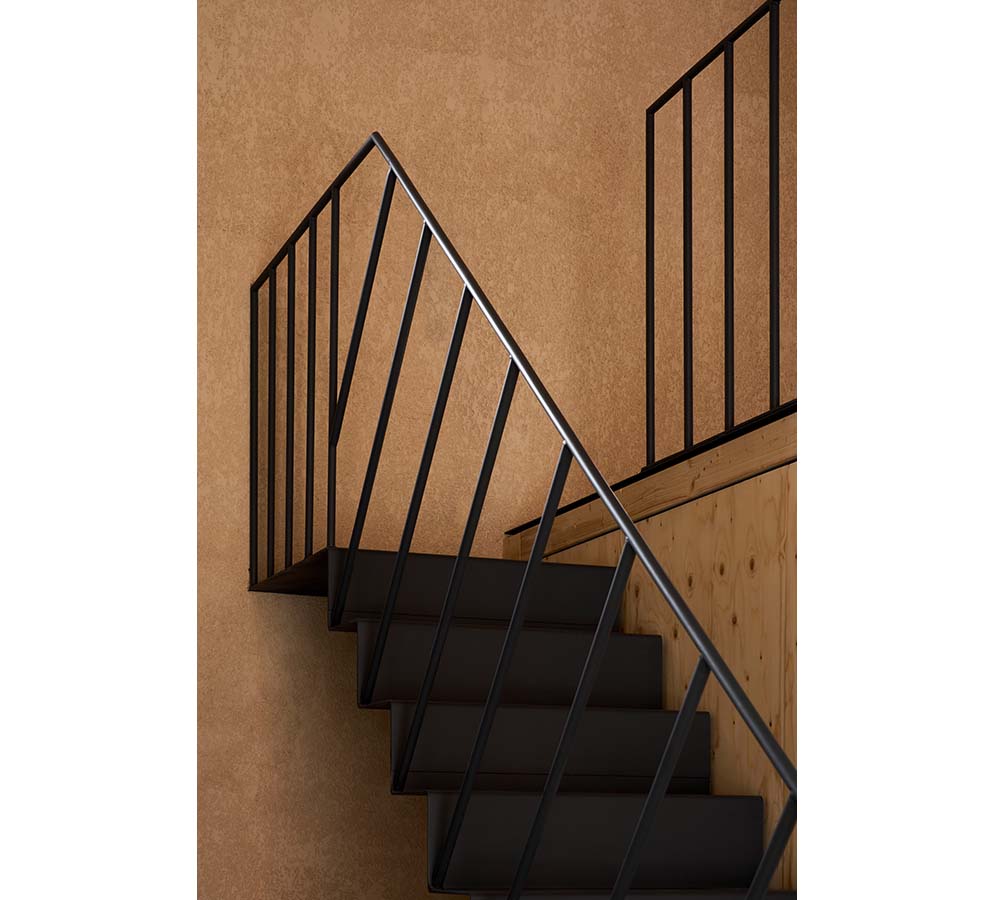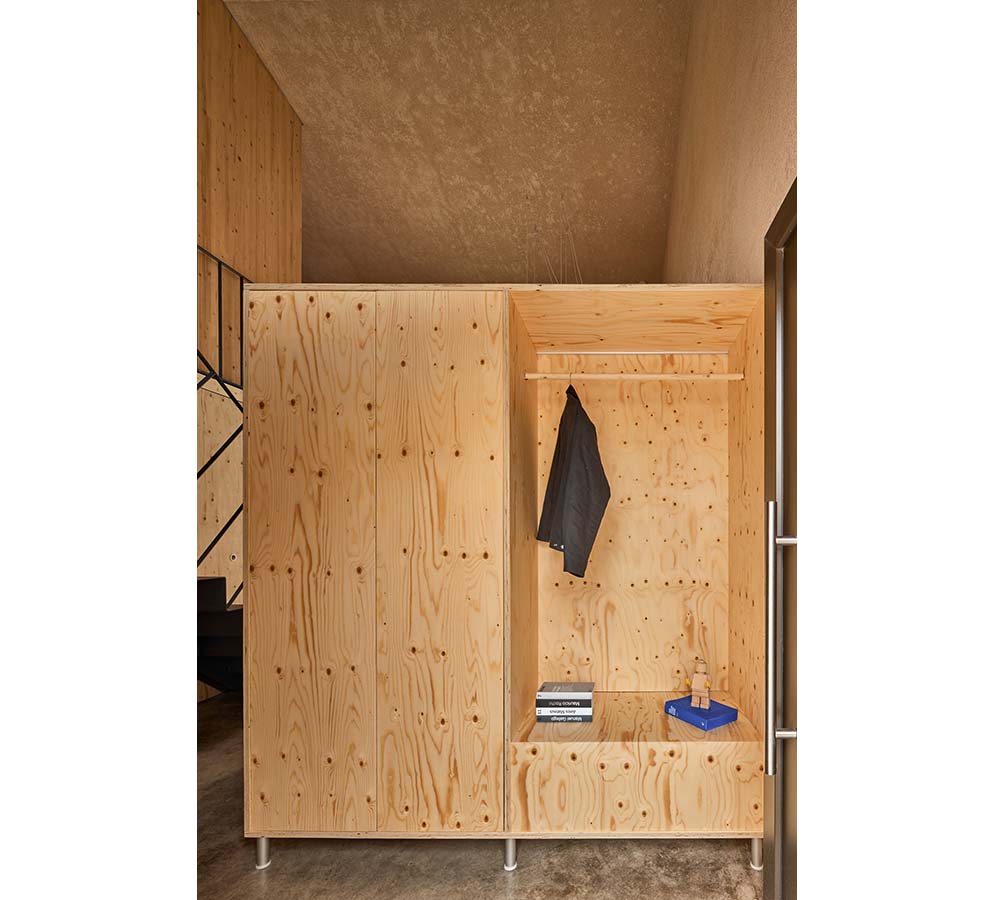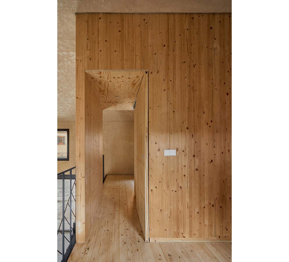 The existing façade, a defining element of the village fabric, was carefully restored. The preserved walls retain the memory of the place while providing a solid frame for new habitation. The interior was completely emptied, and a laminated timber box was inserted within. Partially braced against the outer walls, the box for a living occupies roughly half of the overall volume, establishing a balance between old and new, roughness and warmth, mass and lightness. The resulting interstitial space creates a layered relationship between the retained envelope and the new interior. Rooms are connected or separated by large sliding and hinged doors made from the same timber as the inserted structure, allowing for visual continuity and functional flexibility. Energy performance was also a priority. A continuous insulation layer was added to the inner face of the shell, backed by lightweight partitions and finished with the same single-coat mortar used on the exterior. This ensures thermal continuity and material consistency. The roof was entirely rebuilt in laminated timber, retaining the traditional beam-and-rafter system while enhancing precision and structural stability.