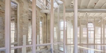 Both the interior and exterior are clad in untreated wooden panels stained in shades of gray. The rough texture of the material and its subtly varied gray tones blend harmoniously with the natural palette, giving the house a timeless presence. Above all, the name humo, which means ‘fog’ in Spanish, reflects the tranquil landscape that merges with the morning mist settling on the lakeshore.
