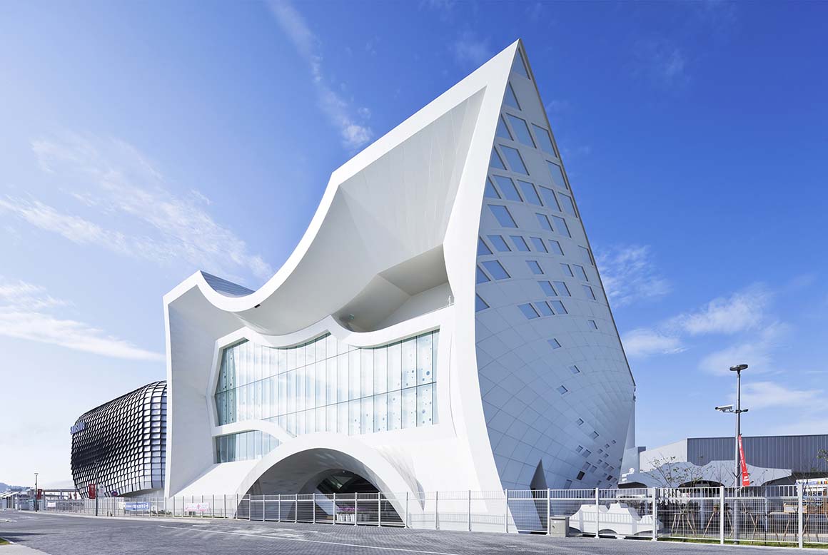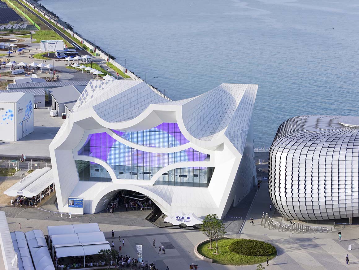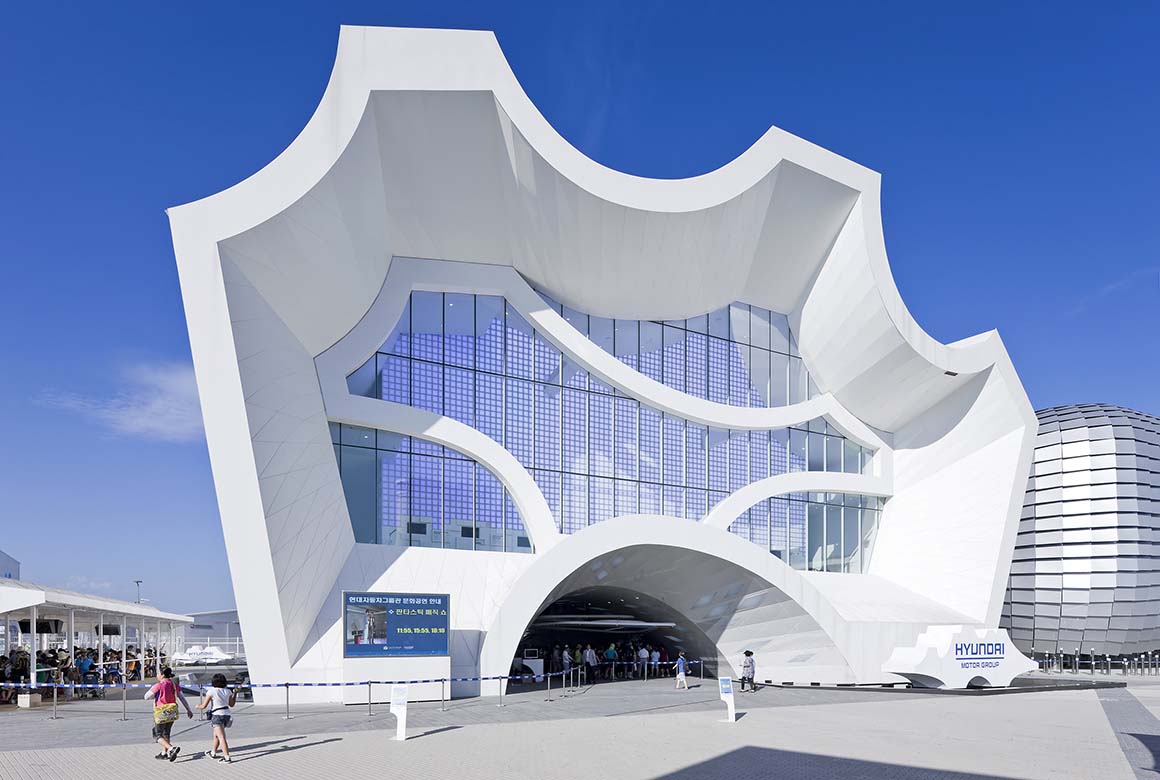 The Yeosu expo Hyundai Motor Group Pavilion seeks to convey Hyundai’s corporate brand image through the use of architecture. Using the concept of ‘motion imagination’, it celebrates the innovation of motor technology alongside the history of transportation. The possibilities of high-tech, and the ever-evolving drive of the Hyundai Motors Group are explored and encapsulated using the form of a wave. Architectural forms resembling three-dimensional ocean waves, overlapping and interconnected also take inspiration from the pavilion’s location by the sea.