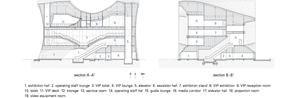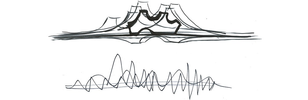 The pavilion is an architecture of linkages. The box-shaped section and sculptural wave forms create a contrasting effect to one another. This contrast is itself symbolic: the waves signify an acceptance of, and connection between, different facets of the organization, such as logical reasoning, emotion, art, technology, history, future vision, simplicity and complexity.