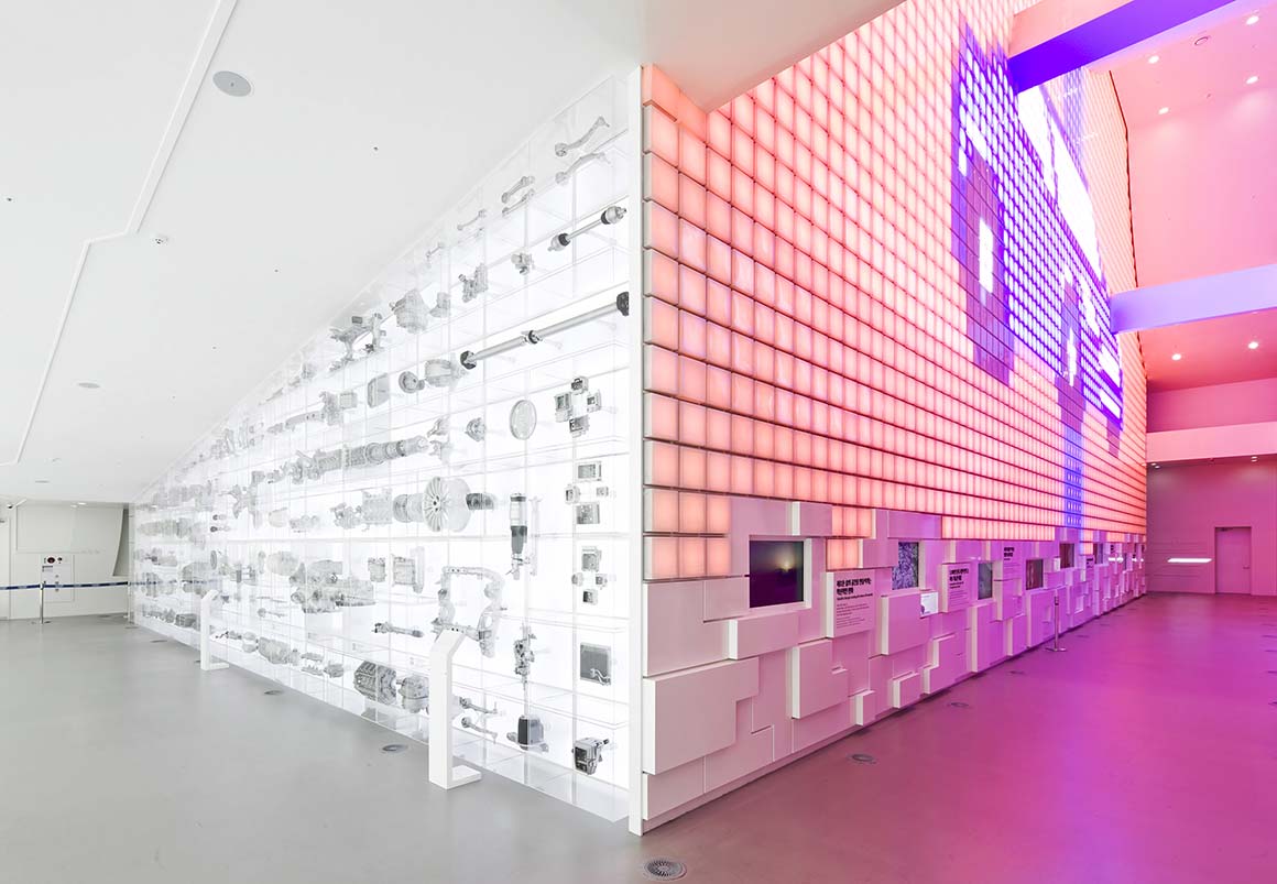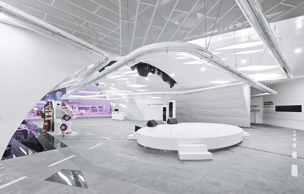 Inside the space of three-dimensional waves, the complexity of urban living is recreated with different spaces exploring the relationship between nature and cities. The Hyundai Motor exhibition space, that of the steel sector, the city street and plaza are composed as weightless spaces. They include a forest concept, resting areas and playing spaces. The pavilion acts as a container of imagination for future human, environmental, urban, technological and energy scenarios.