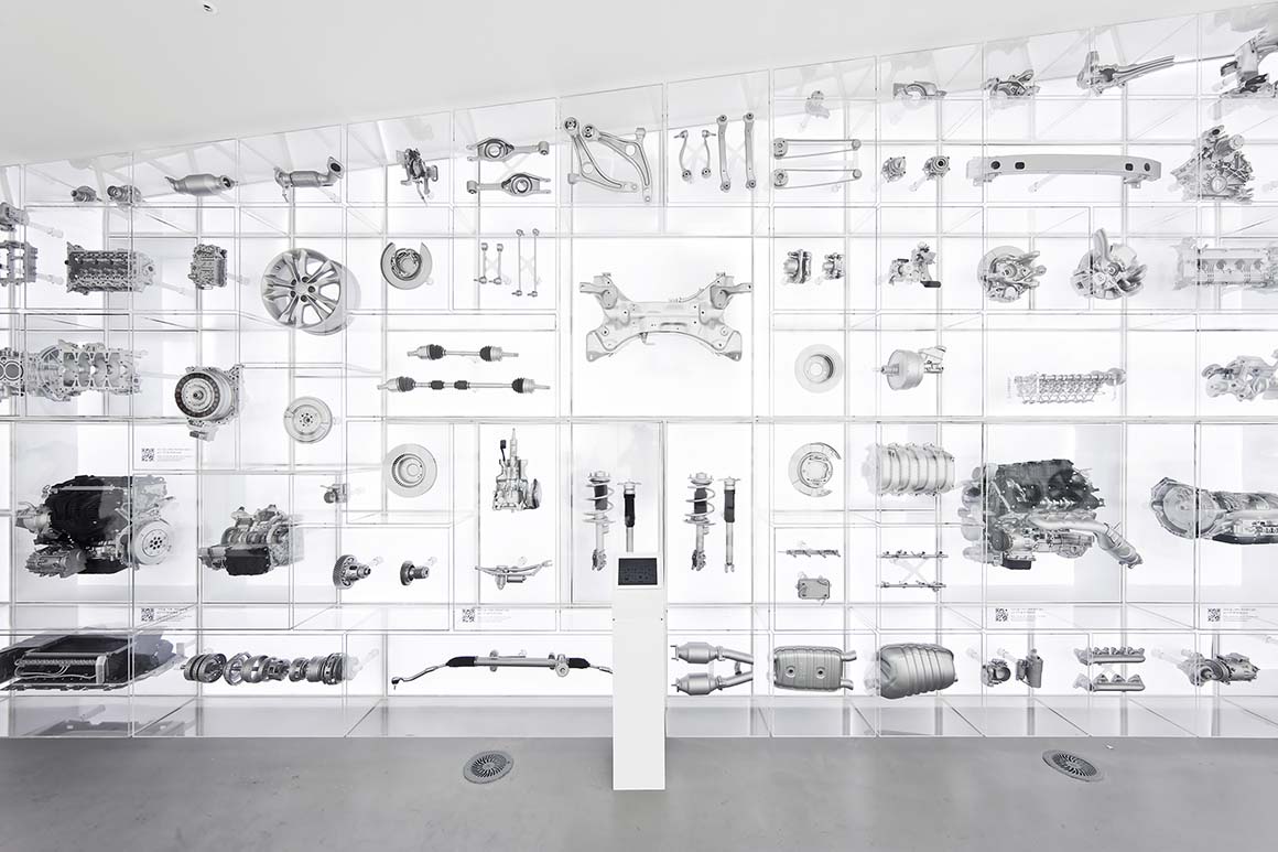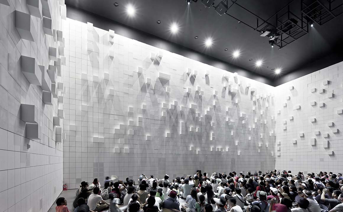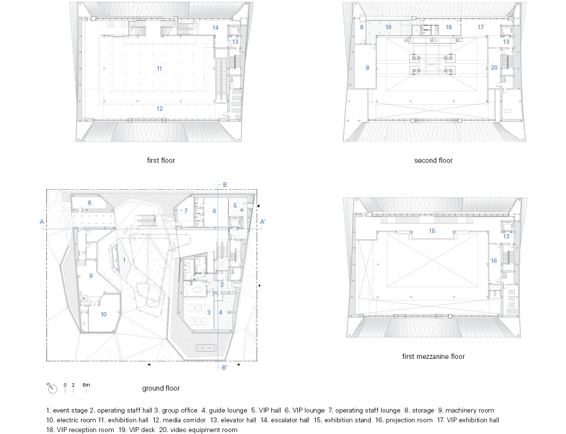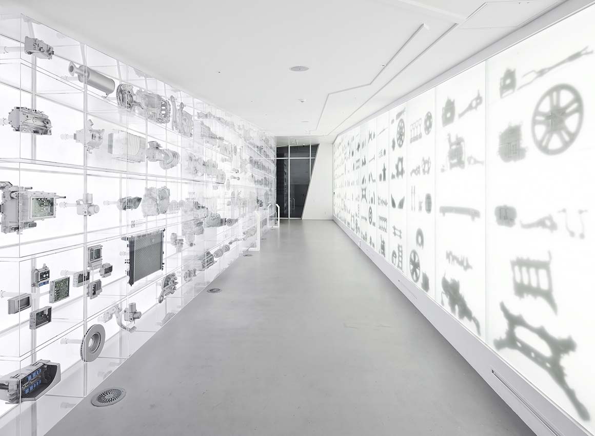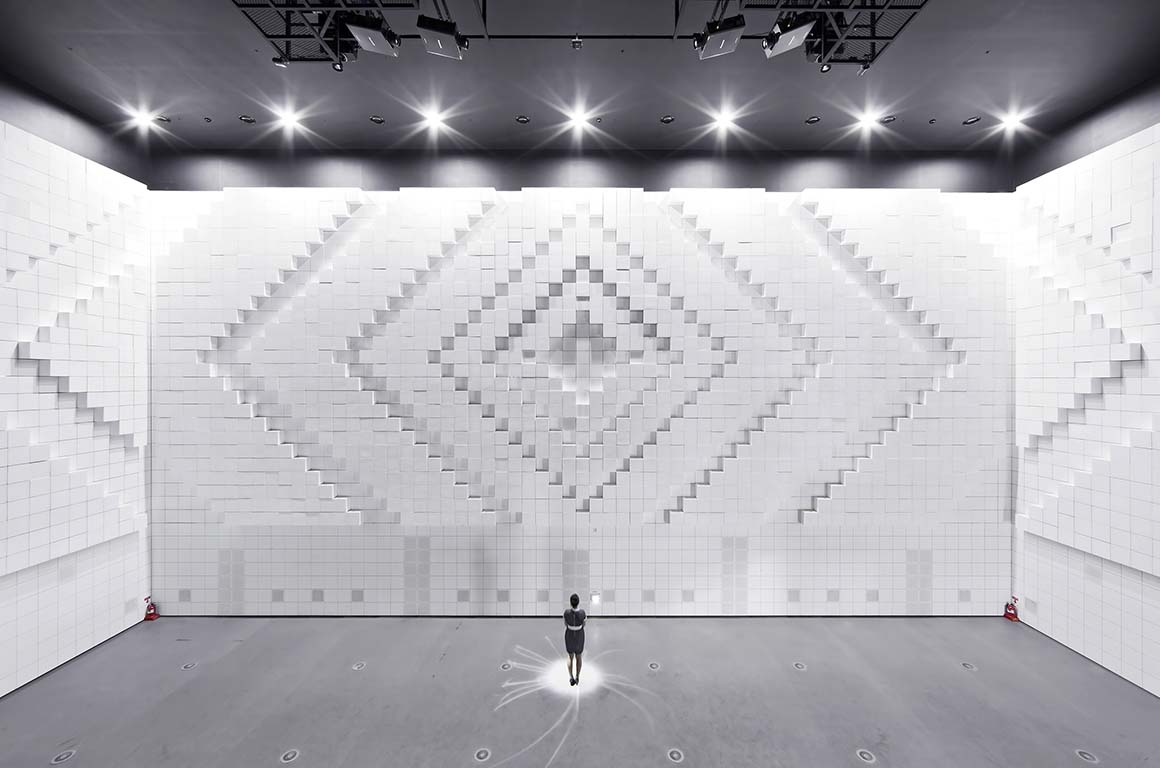 The empty exhibition spaces, such as the interior atrium, are changeable, due to the cuboid matrix box formation. By starting with a white cube, which is a standard unit, acting as the basis of all matter, the philosophy of transforming movement is realized as an interior exhibition concept. This is achieved through the wall of spectacle, composed of various cubes, mechanically set in motion.