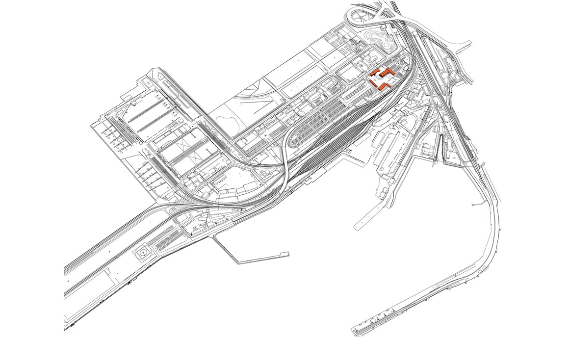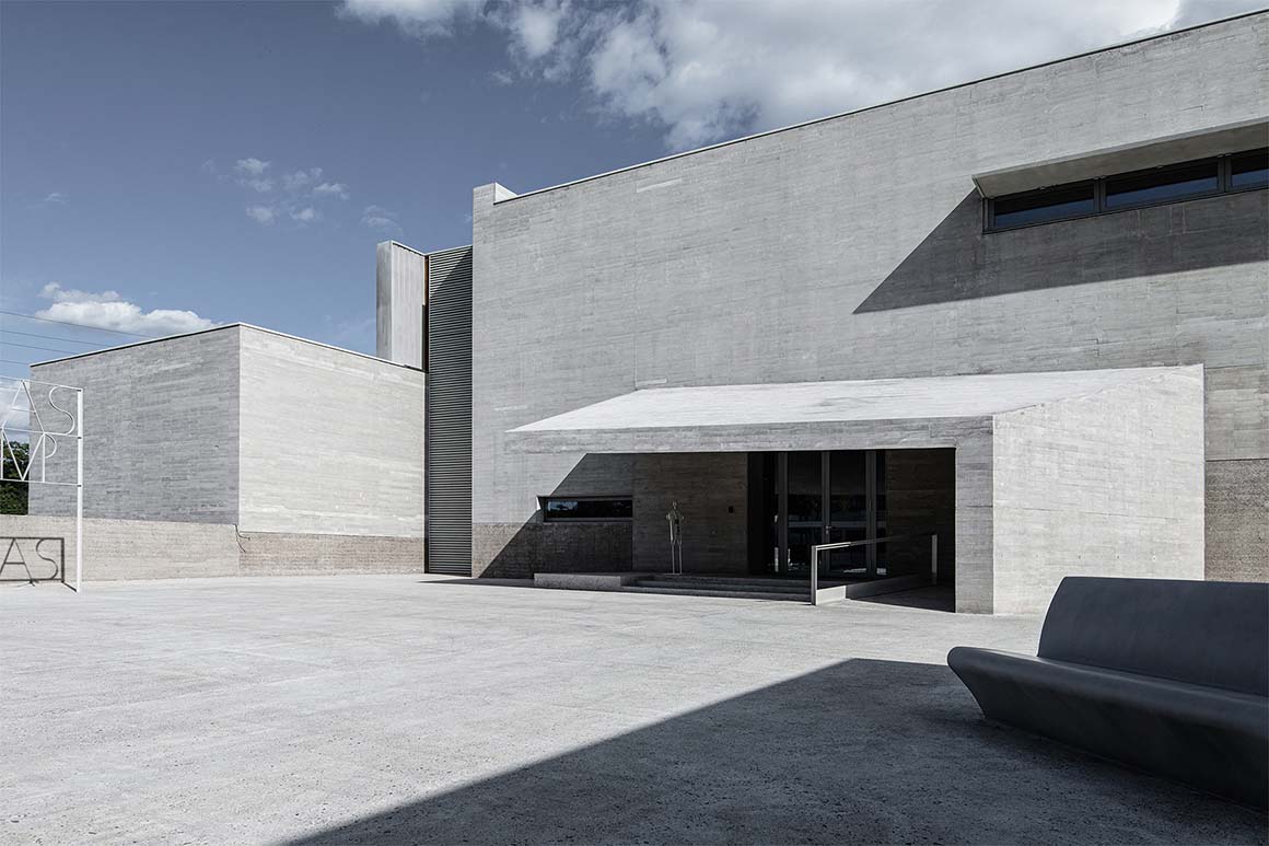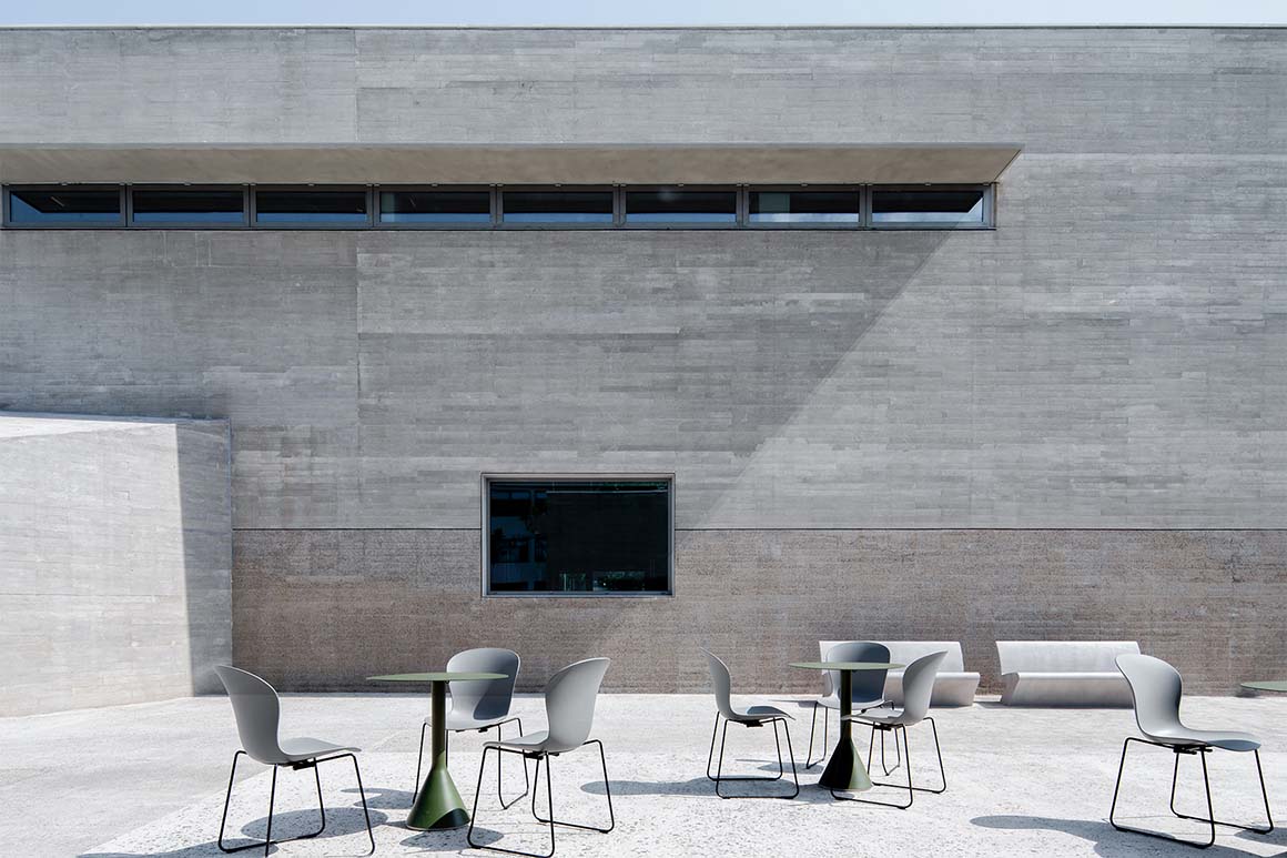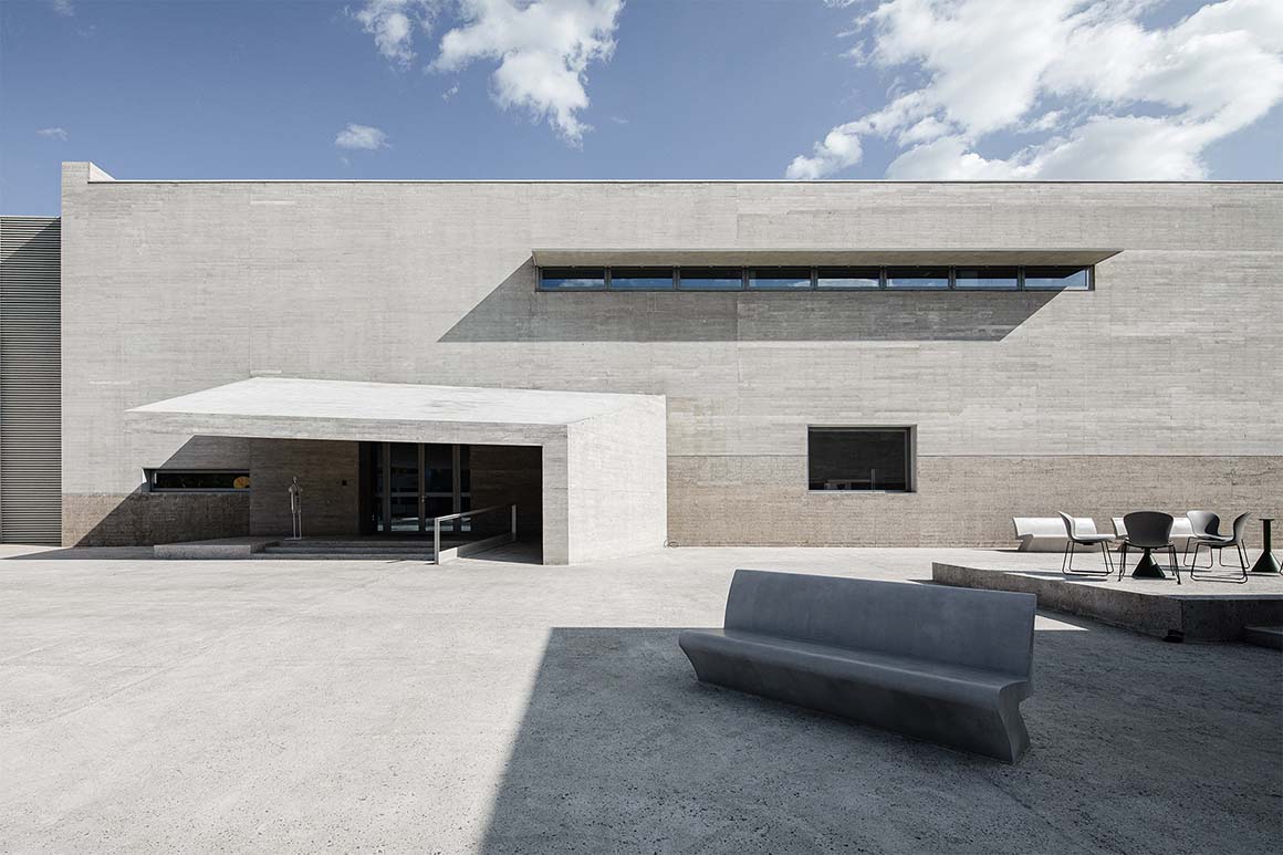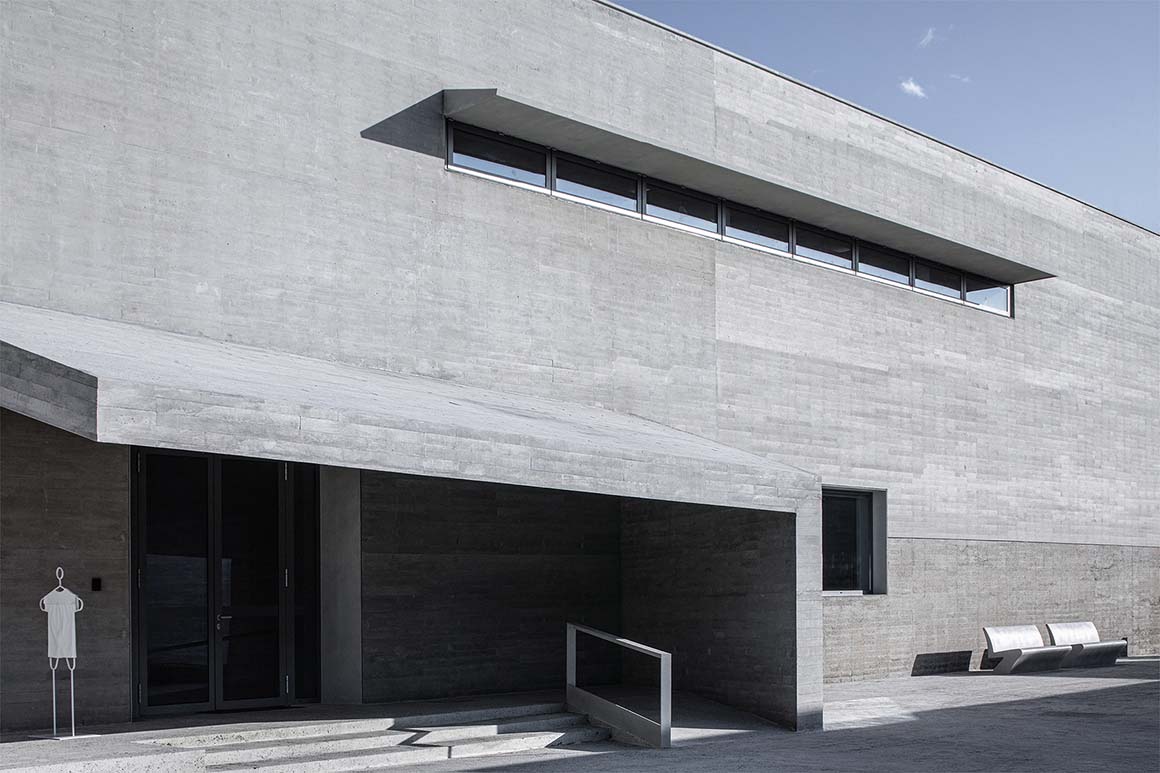 Between the three building volumes, the awning of the art center entrance cantilevers outwards, forming a thick shadow on the north façade of the building volume, showing the entrance of the building. The buildings are enclosed by concrete from wood-textured formwork, which gives the entire building group a strong hand-crafted feeling, rooting it in the memory cycle of the century-old port.