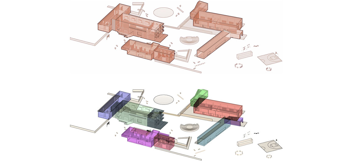 The eight buildings are linked and anchored together to form three new volumes. Mass A consists of three buildings on the east side, and its functional content includes art exhibition halls, baking workshops, and family apartments. Mass B, in the middle, consists of two buildings, including the reception center, souvenir store, multimedia exhibition hall, and mentor workshop. Mass C is composed of three buildings to the west, including a carpentry workshop, traditional culture workshop, small theater, and nature workshop.