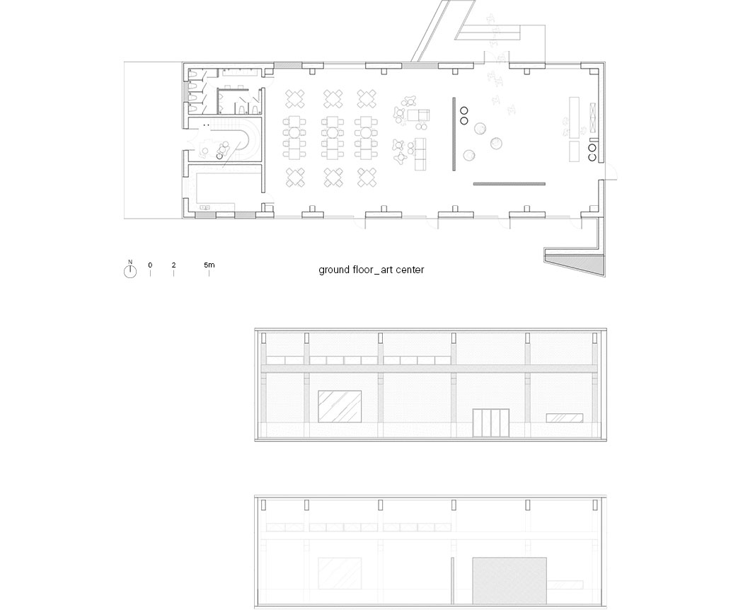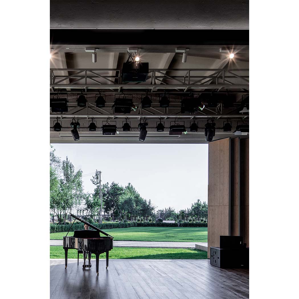 The interior space of the art center is kept as it was. The original building’s “fish-belly-shaped” beams, cranes, red brick walls and concrete floors are preserved to the greatest extent. The north side of the building façade uses high windows for daylighting, and the south façade is fitted with shading volumes. This façade design brings mottled daylight into the interior space. All the doors and windows are designed with shading systems, providing possibilities for different exhibition needs.