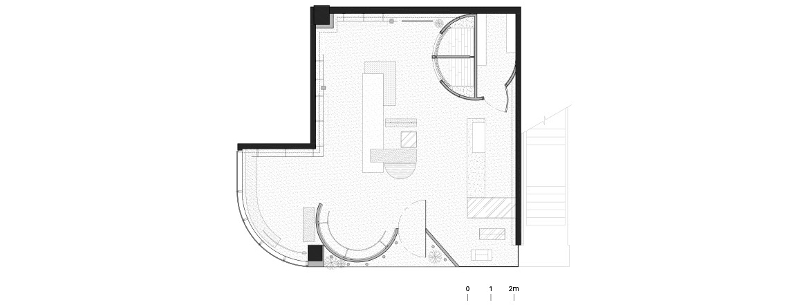 The second crucial design element derives from the idea of an embrace, and is expressed through texture on the inside walls. Beginning with the ceiling and moving down along the walls in an ㄱ-shape is a bumpy textured finish. Starting at the floor level and moving up along the walls in the ㄴ-shape is a smooth surface finished with concrete hardener. In the center is a curved, round mass. The effect conveyed is one of a warm, comfortable, embrace within the interior.