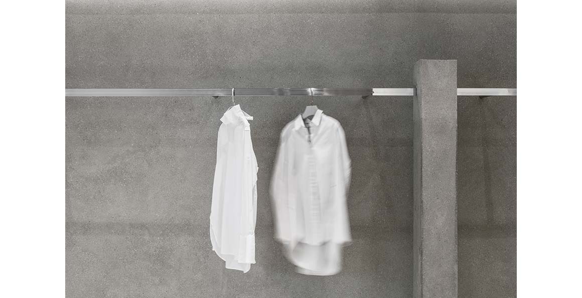 In each sequence, a rounded shape, a rectangle, a curved surface, planes and lines – in the form of walls, columns, hangers, furniture, shelves, chairs, counter and fitting room – provide rhythm and fun to the space as they overlap and tangle with one another.