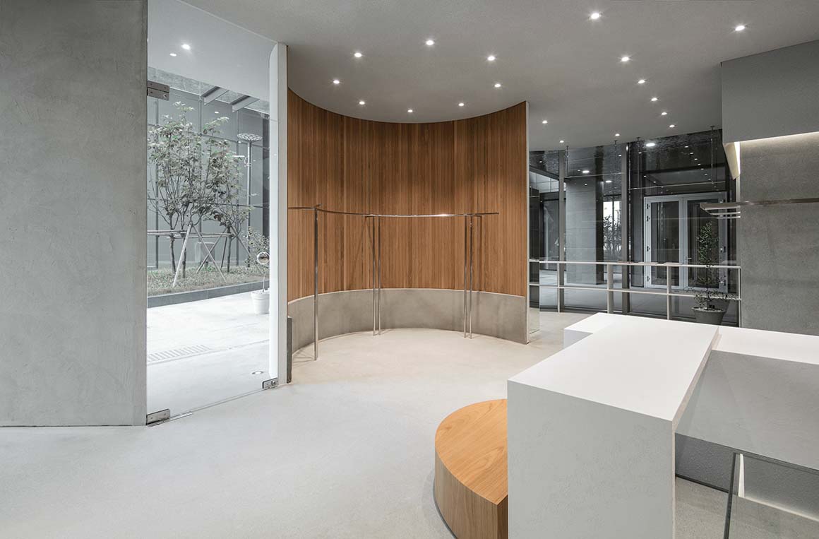 Material contrasts between walls and furniture repeat continuously in this overlapping way. Four finishing materials – rough stone powder, clear white glass, warm wood, and cold metal – interconnect to express a radical contrast in temperature.