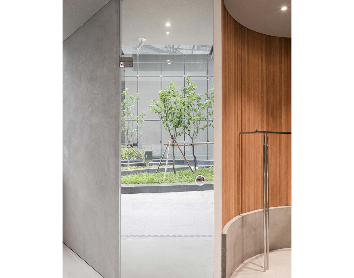 There are three important features of the design. Firstly, that of contrast in texture and form. Contrasts are vividly revealed in forms and materials, beginning with the entrance itself. The form of the façade is expressed in an abstract, dynamic, style with an arrangement of round shapes and straight lines which captivate the interest of the visitor, welcoming them inwards. Finishing materials also add volume to the space: round columns of white oak wood appear to overlap between clear glass and a rough stone-powder-treated paint, which gives the impression of heaviness and mass.